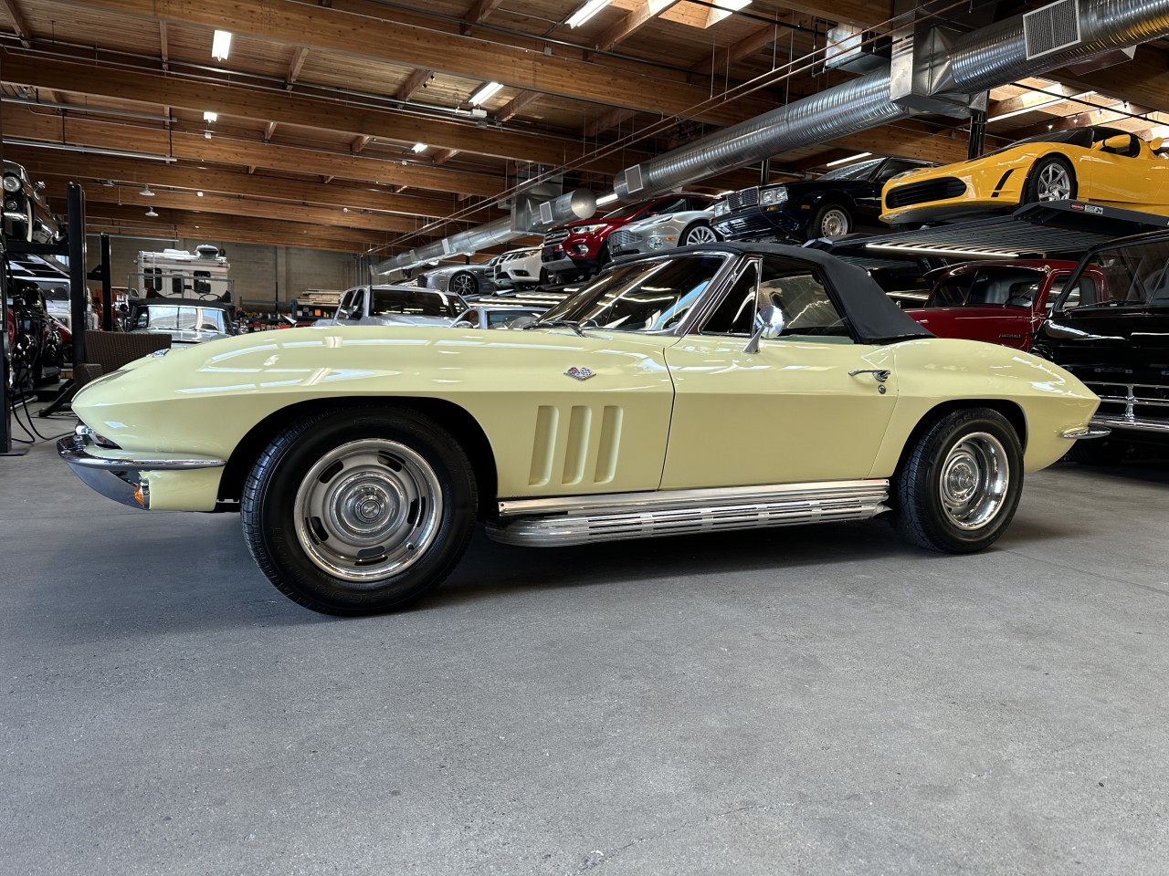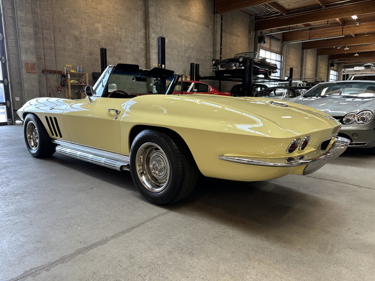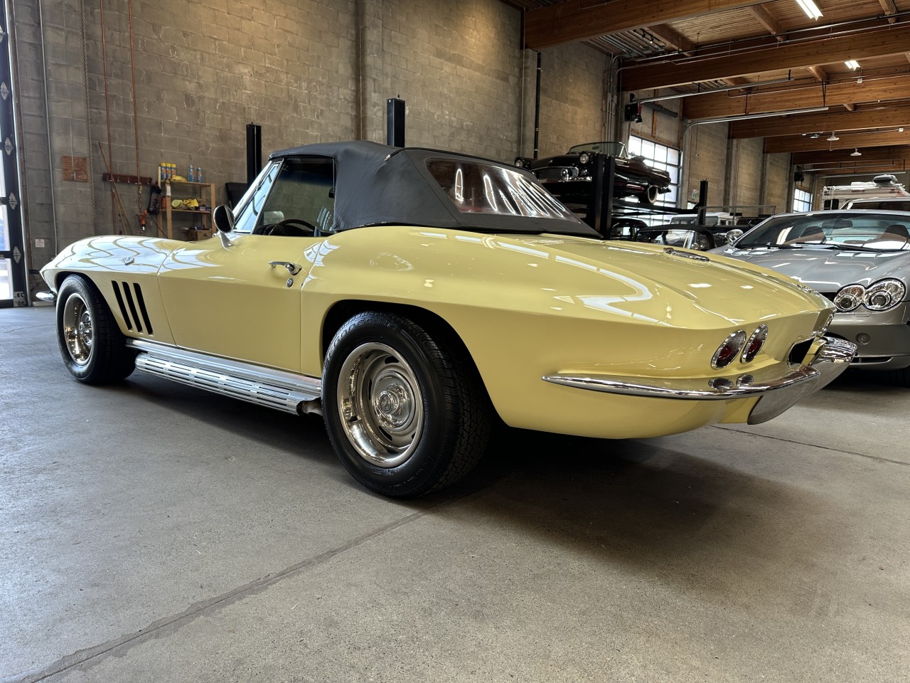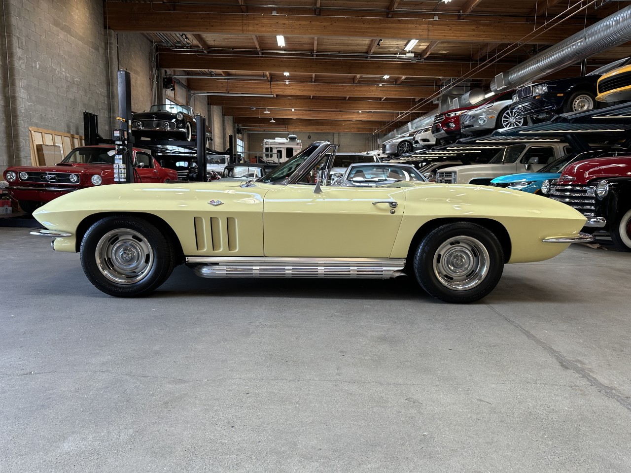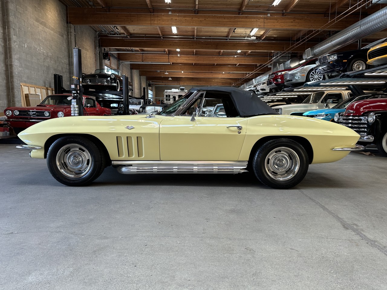 1965 Chevrolet Corvette Convertible 327/365 4-Speed. Numbers matching car. 28,000 Miles, 5 Digit ODO. Well equipped with Black leather seats, Delco AM / FM radio, Three spoke steering wheel, Power windows, Black convertible top, Side mounted exhaust system, Flip up headlights, 15" Rally-style wheels. 327Ci V8 mated to a 4 speed manual transmission rated new at 365hp / 350lb-ft. Well maintained and just serviced. Leasing and financing available. All trades accepted.