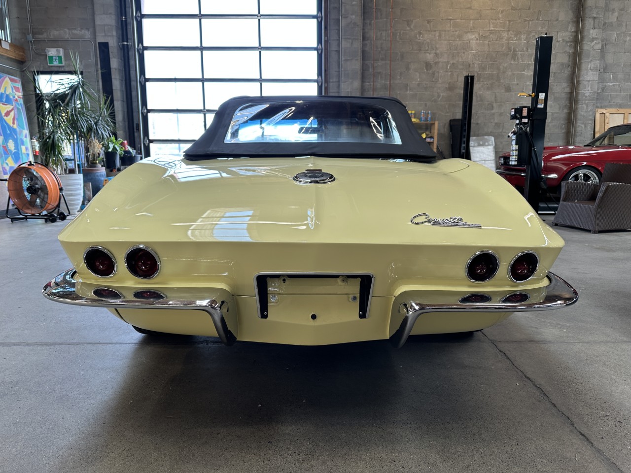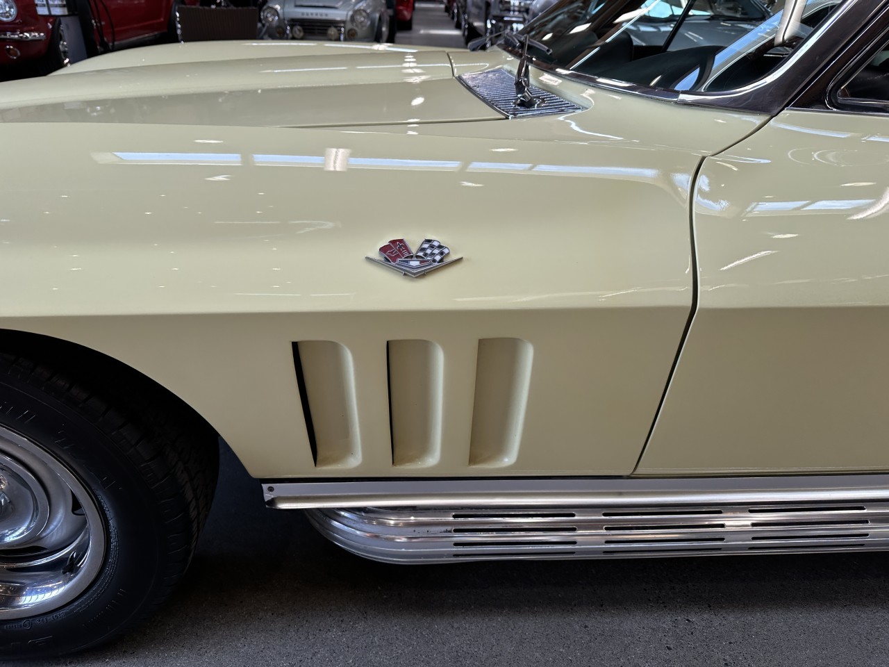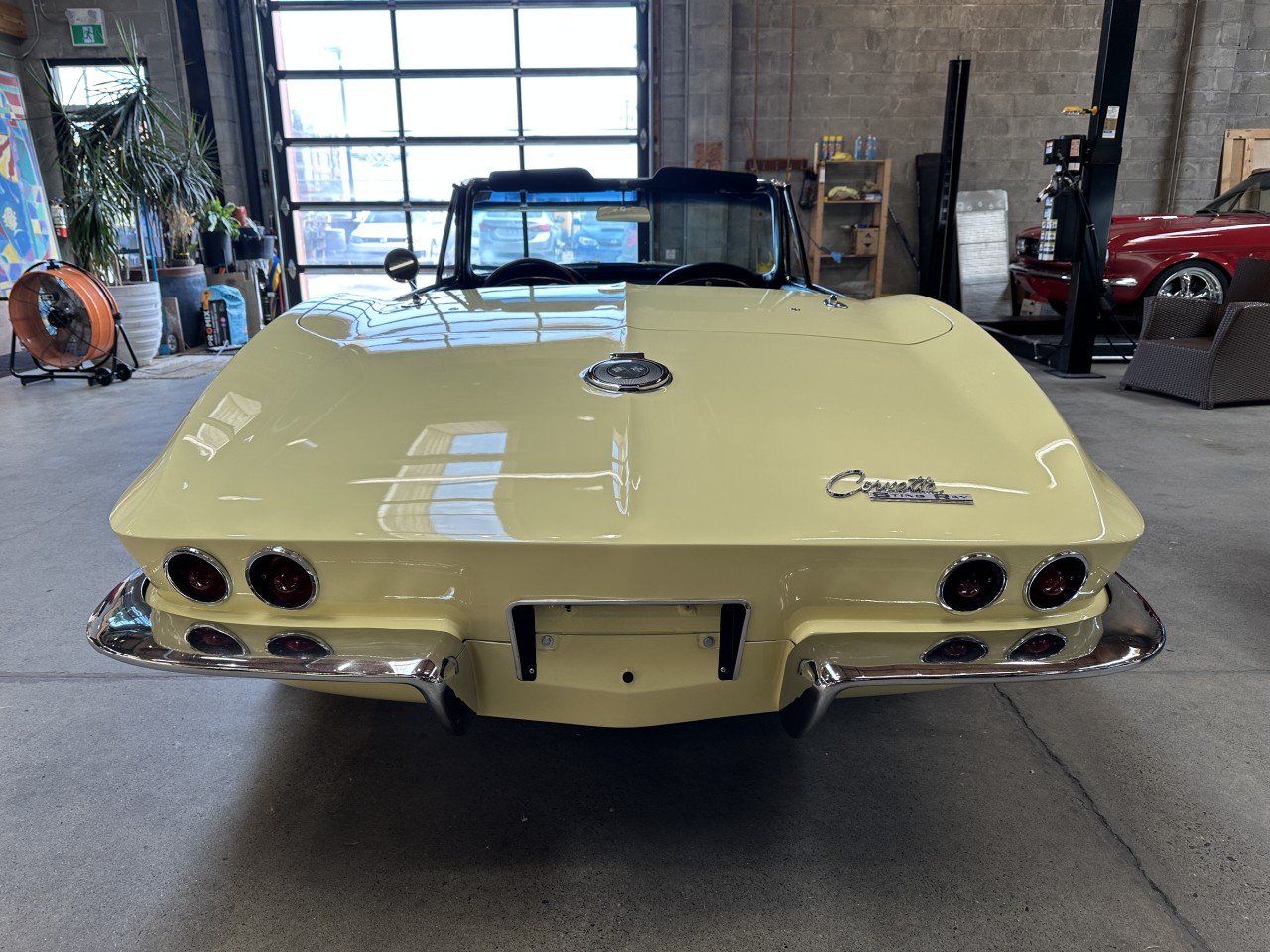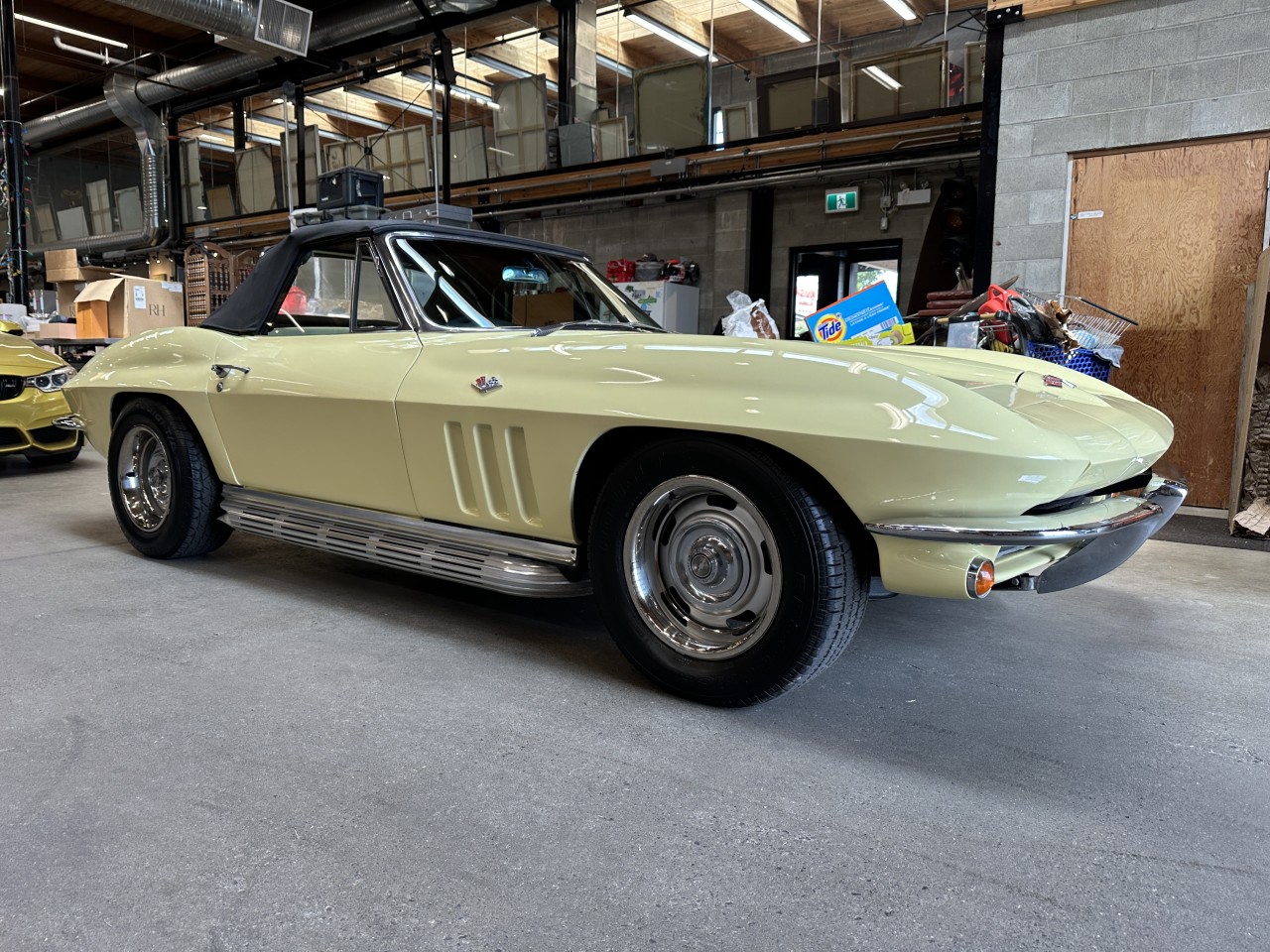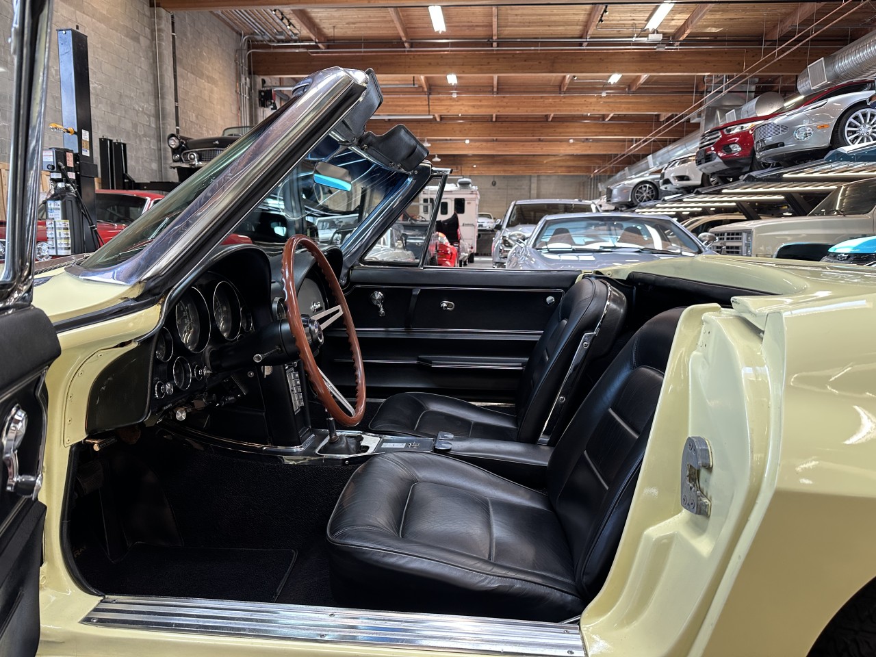 1965 Chevrolet Corvette Convertible 327/365 4-Speed. Numbers matching car. 28,000 Miles, 5 Digit ODO. Well equipped with Black leather seats, Delco AM / FM radio, Three spoke steering wheel, Power windows, Black convertible top, Side mounted exhaust system, Flip up headlights, 15" Rally-style wheels. 327Ci V8 mated to a 4 speed manual transmission rated new at 365hp / 350lb-ft. Well maintained and just serviced. Leasing and financing available. All trades accepted.