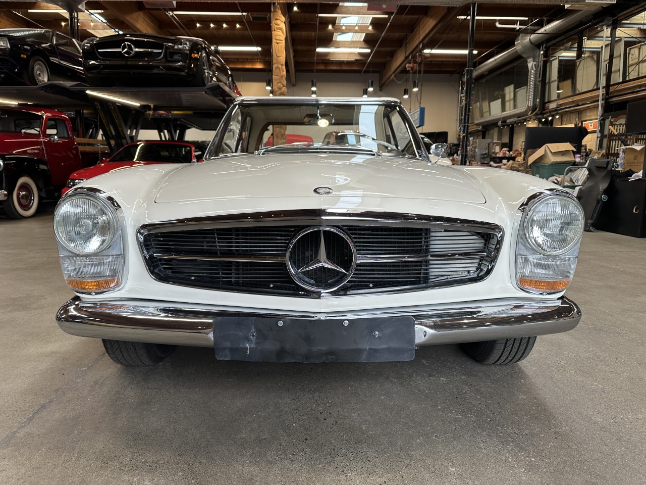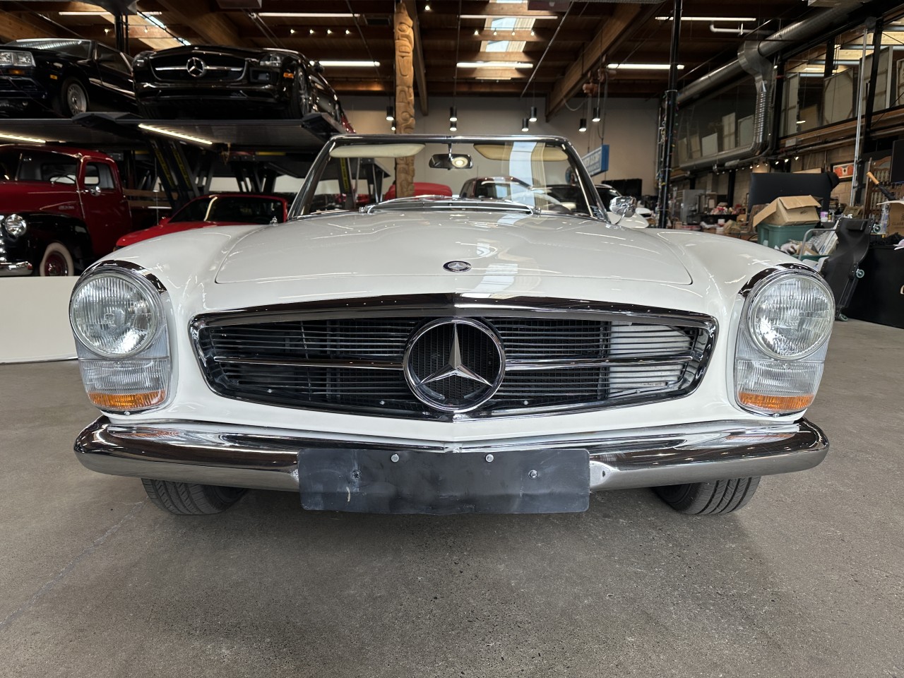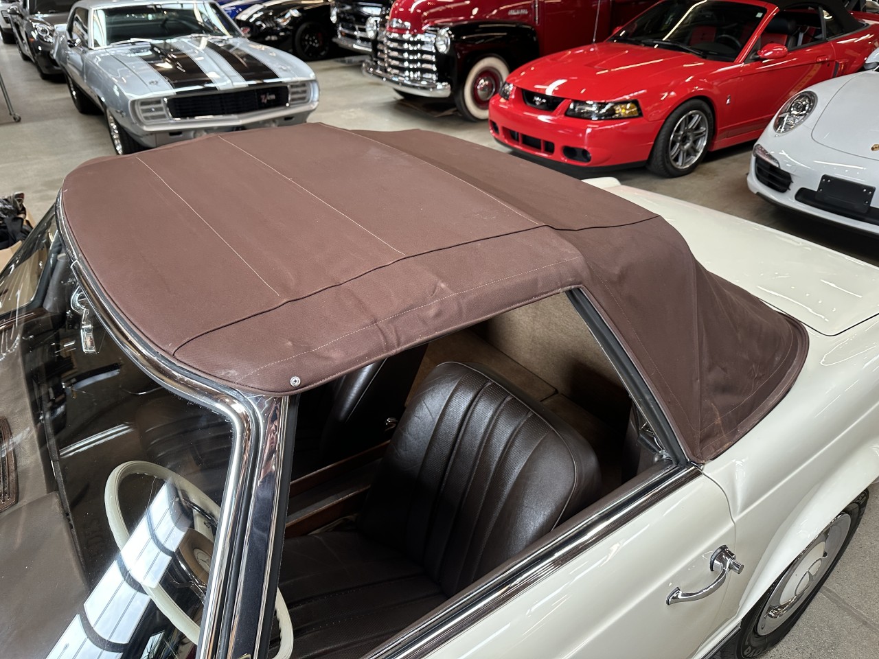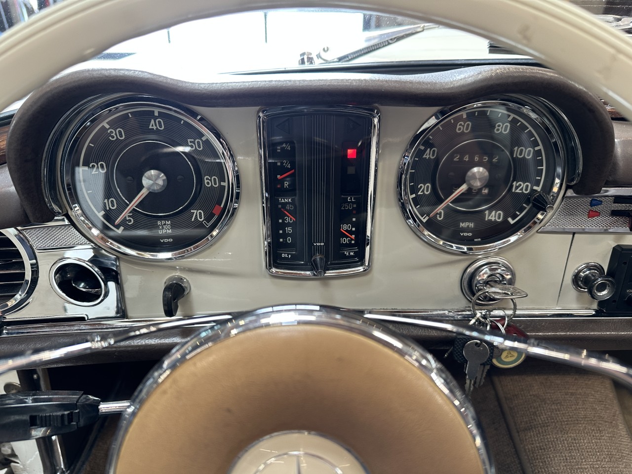 1966 Mercedes-Benz 230SL Roadster. 24,800 Miles (5 Digit ODO). Well equipped with Brown leather seats, Blaupunkt tape deck, Two-spoke white steering wheel, Wood trim, Colour matching Pagoda top, Brown soft top, 14" wheels, Hubcaps with white-finished centers. 2.3L Inline 6 cylinder mated to a 4 speed automatic transmission rated by the factory new at 118hp / 137lb-ft. Well maintained and just serviced. Leasing and financing available. All trades accepted.