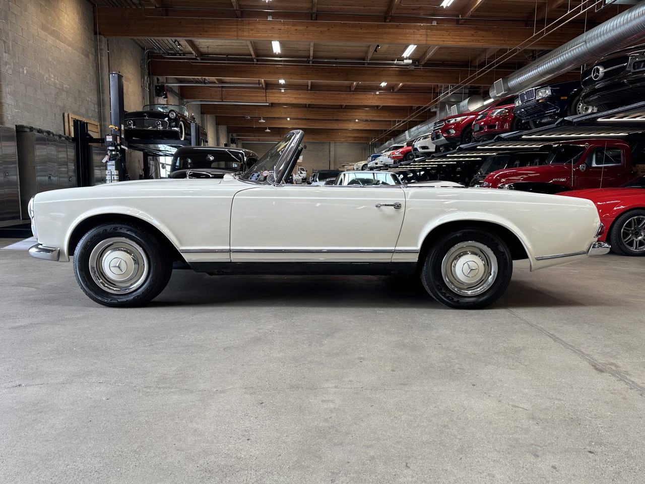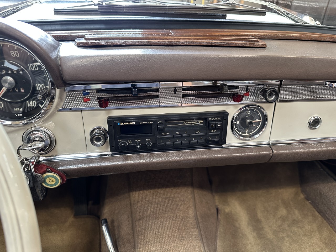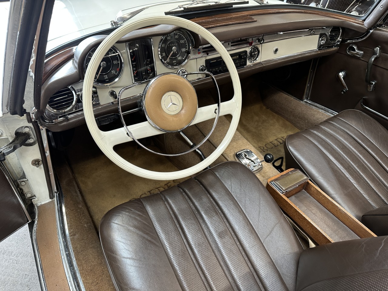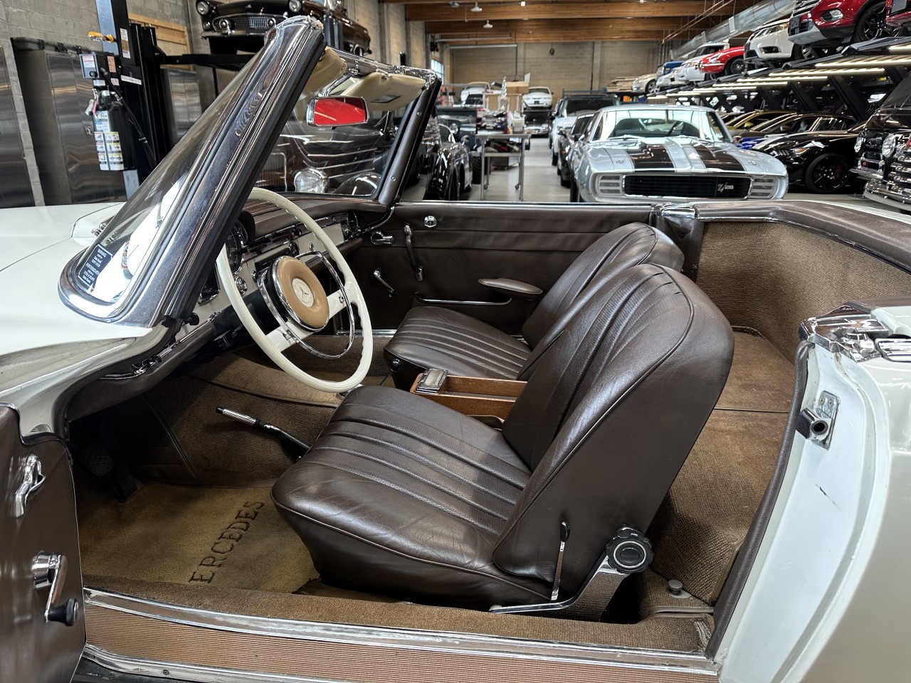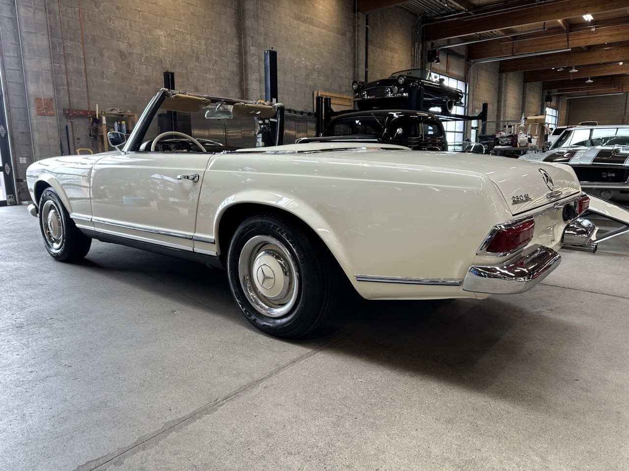 1966 Mercedes-Benz 230SL Roadster. 24,800 Miles (5 Digit ODO). Well equipped with Brown leather seats, Blaupunkt tape deck, Two-spoke white steering wheel, Wood trim, Colour matching Pagoda top, Brown soft top, 14" wheels, Hubcaps with white-finished centers. 2.3L Inline 6 cylinder mated to a 4 speed automatic transmission rated by the factory new at 118hp / 137lb-ft. Well maintained and just serviced. Leasing and financing available. All trades accepted.
