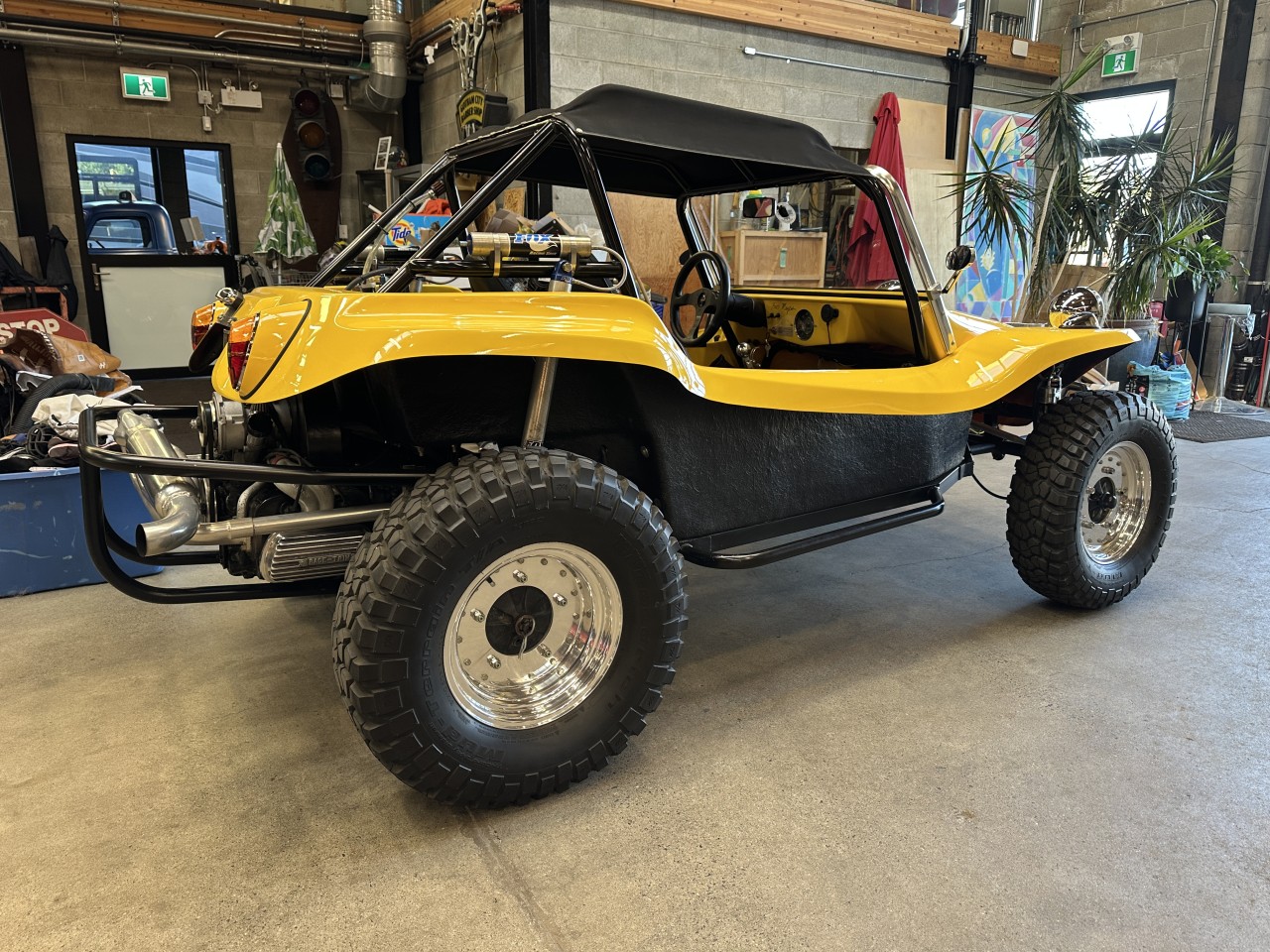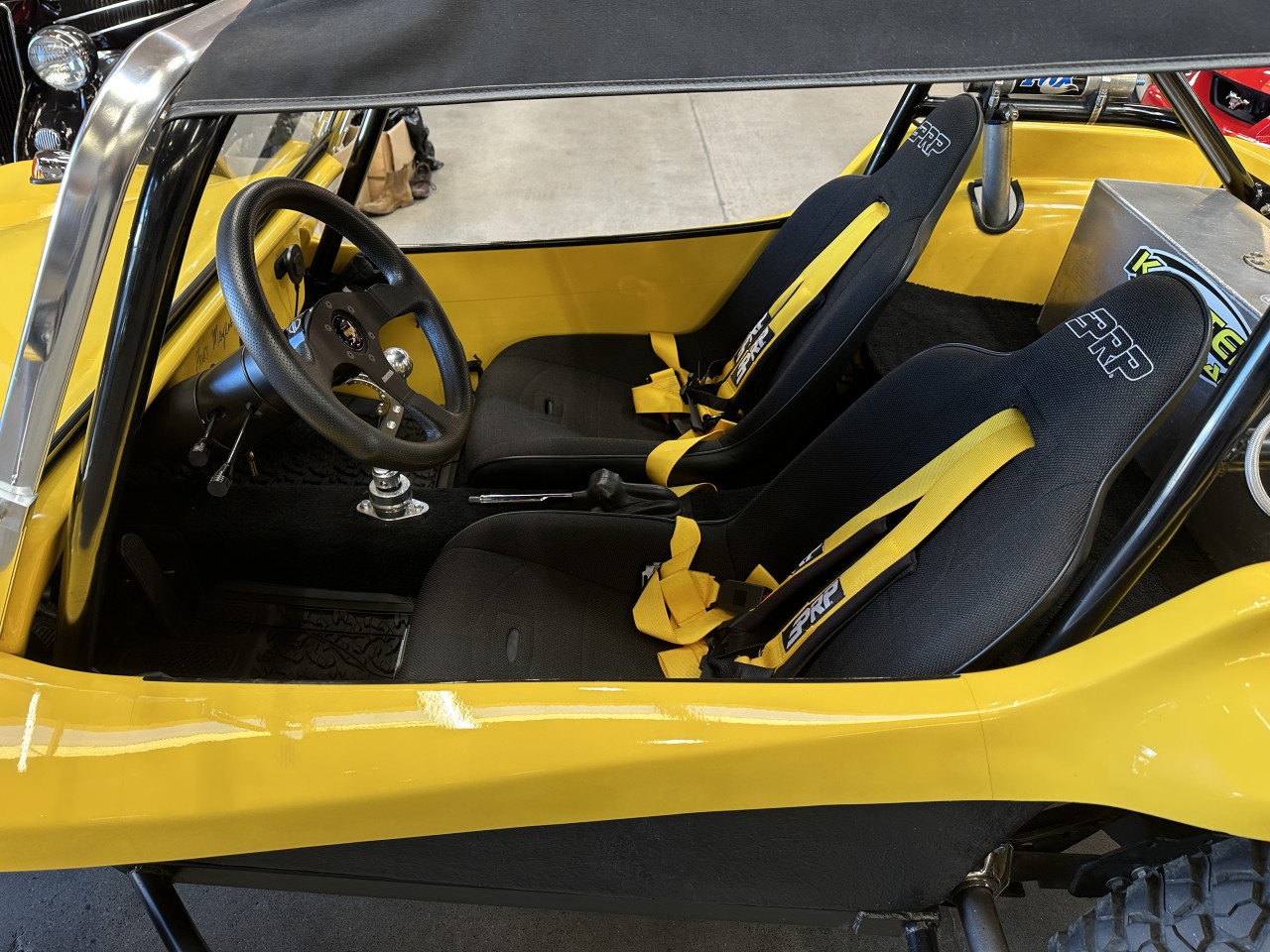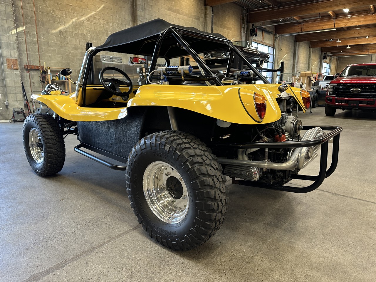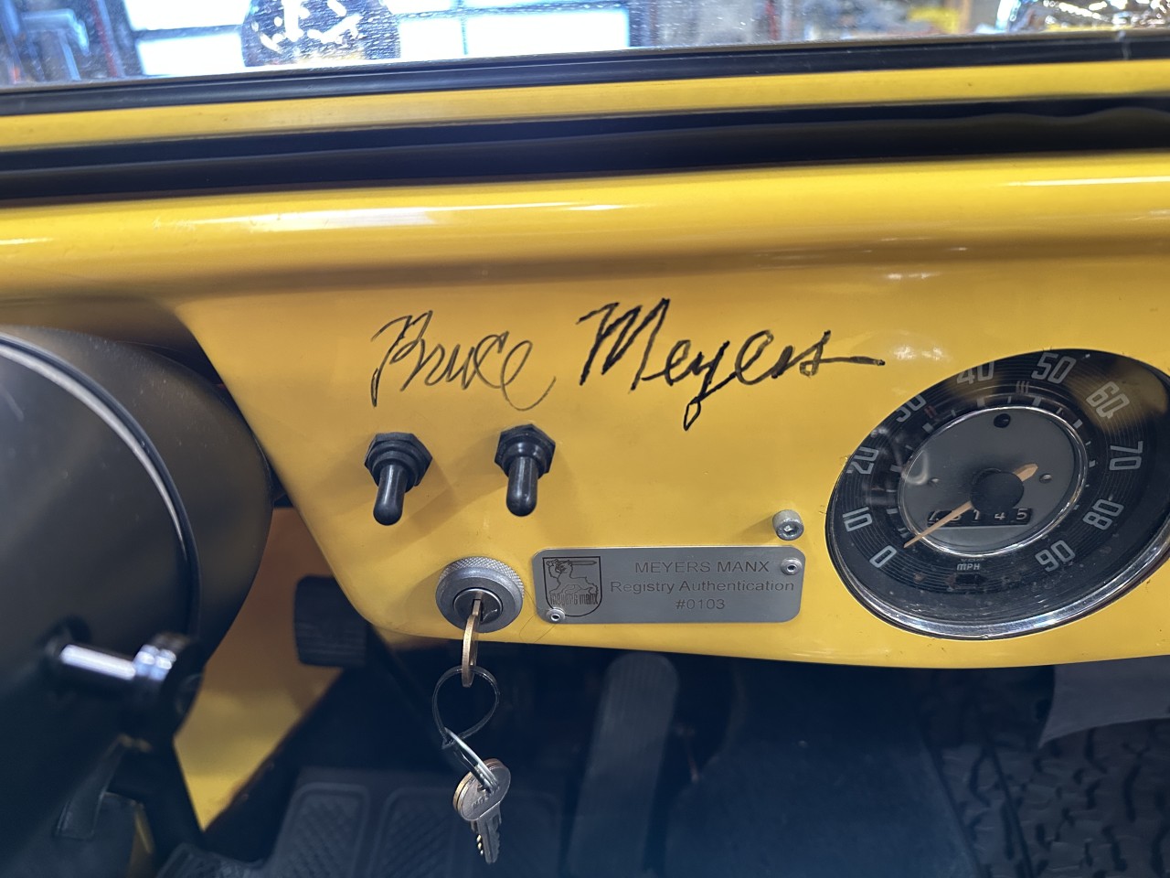 1965 Meyers Manx. Registry Authentication #0103, singed by Bruce Meyers. Featuring PRP Racing seats with 4 point harnesses, Momo Competition steering wheel with quick release, Vintage speed black mamba sports shifter, Roll cage, Black soft top, LED Baja designs front lights, Rear mounted fuel cell, Rear engine cage, Side step bars, Fox external reservoir shocks, 15" Polished wheels with BFGoodrich Mud-Terrain T/A KM2 235/75R15 Fronts and 31x10.5R15 Rears. 1600cc Dual port flat 4 cylinder mated to a 4 speed manual transmission. All trades accepted.