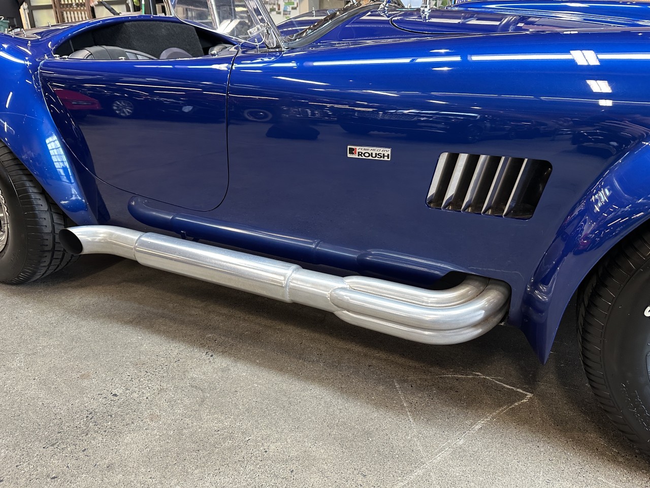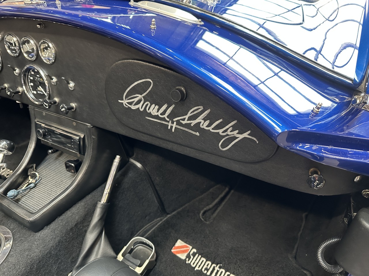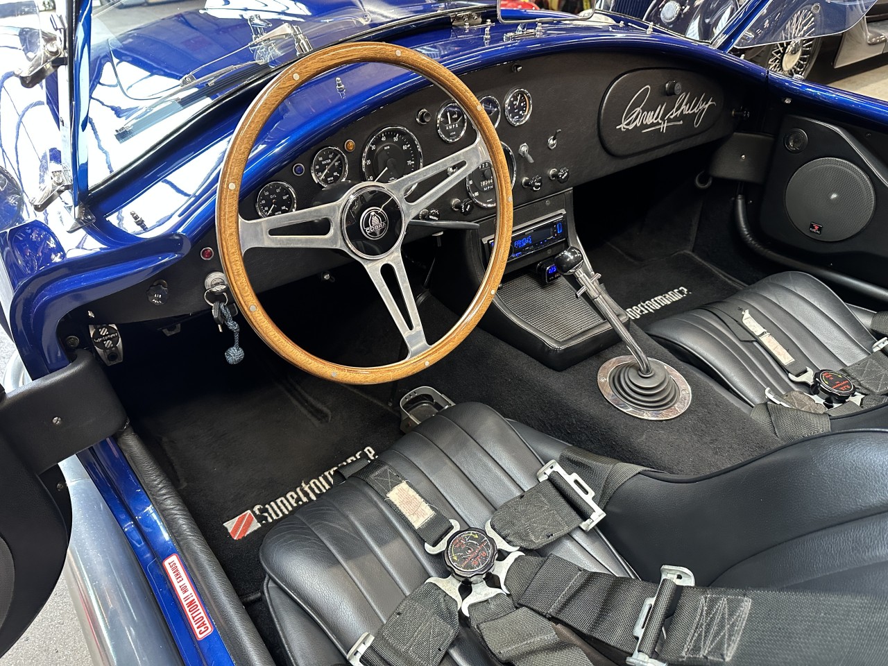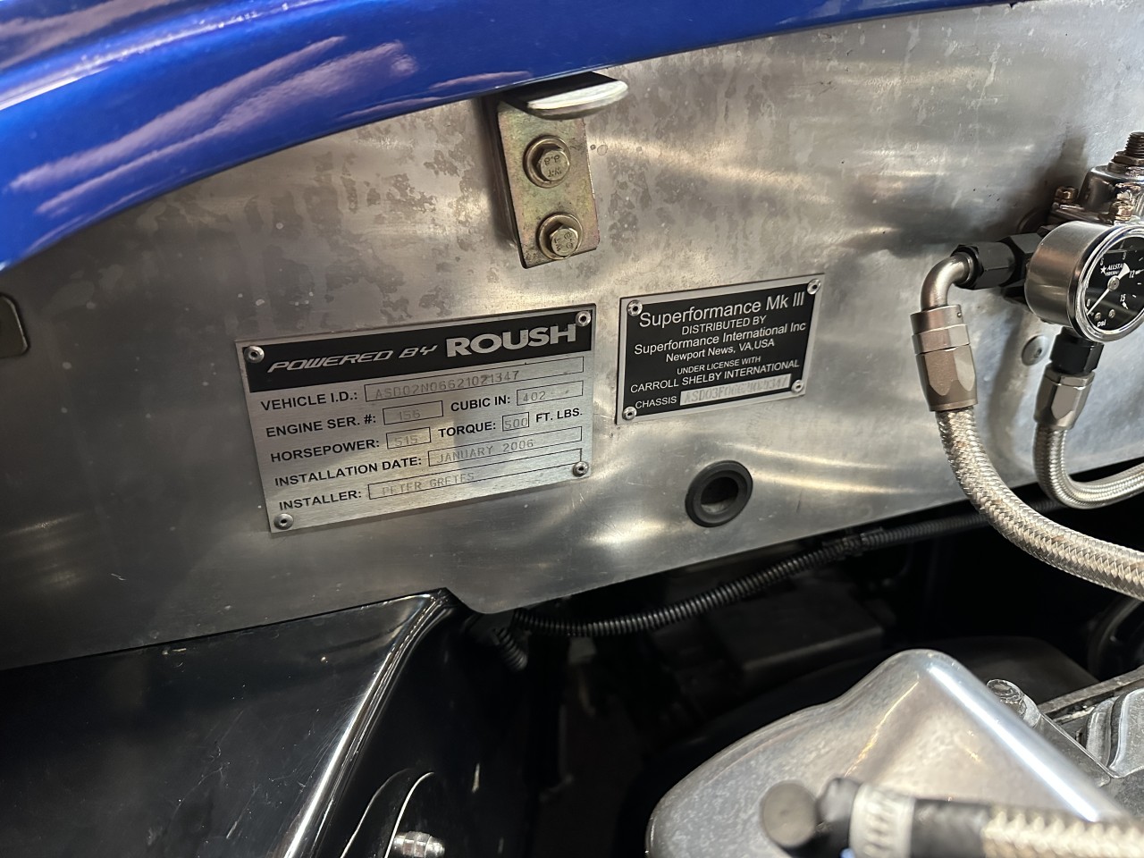 Roush 402R-Powered Superformance Mark III 5-Speed assembled in 2006. Featuring Leather seats, RJS Racing 5-point camlock belts, Wood-rimmed steering wheel, Smiths instrumentation with a reverse-sweep 180 MPH speedometer, Kenwood deck, Aux input, Usb input, Bluetooth, Bluetooth audio, Spotify, Pandora, Focal component speakers and subwoofer, Clarion amp, Cup holders, Shelby signed glove box, Superformance floor mats, Holly carburetor, Aluminum cylinder heads, Forged crankshaft and pistons, Tubular exhaust headers, Side-exit exhaust pipes, MSD Ignition components, Roush branded air cleaner cover and valve covers, Single roll hoop, Fiberglass body, Quick-jack bumperettes, Hood scoop, Fender vents, Wind wings, Talbot Berlin-style mirror, LeMans-style fuel filler cap, Blue hardtop, Black soft top, LED Headlights, Dana differential, Four-wheel disc brakes with Wilwood calipers, Coil-over suspension, 15" Halibrand-style knock off wheels with Mickey Thompson Sportsman S/T tires. Roush built 402ci V8 mated to a Tremec TKO600 5 speed manual transmission rated by the factory new at 515hp / 500lb-ft. Well maintained and just serviced. Leasing and financing available. All trades accepted.