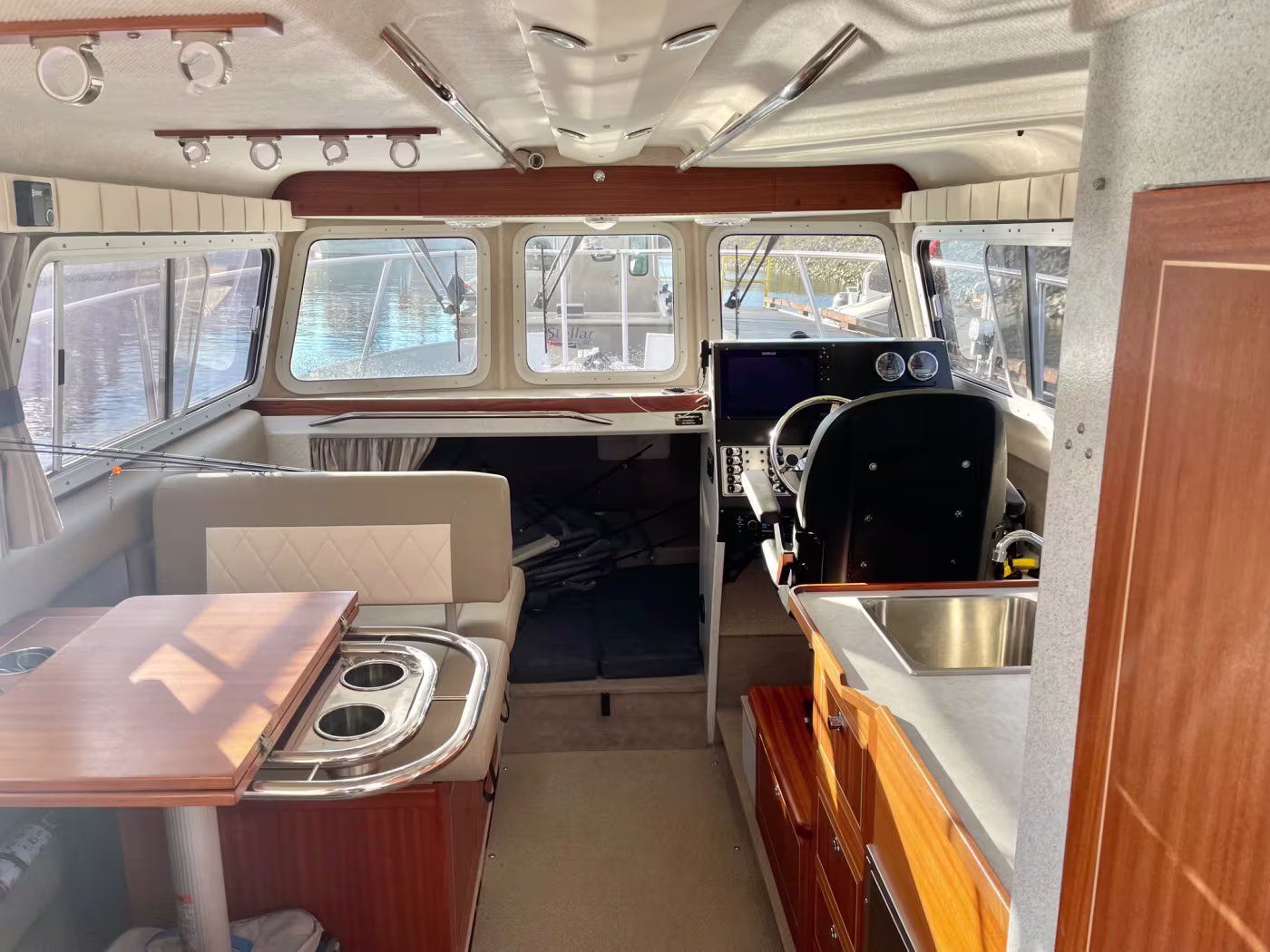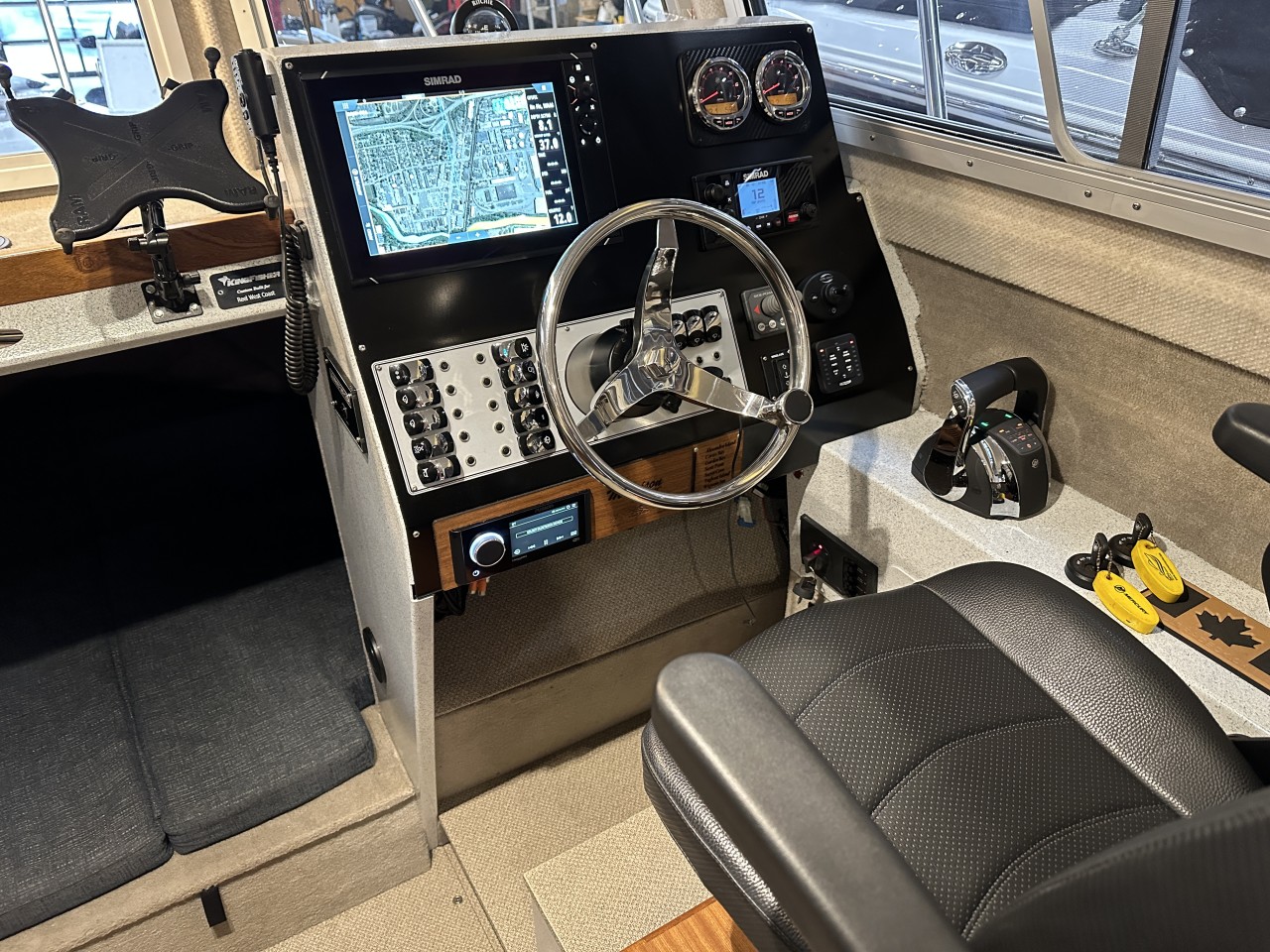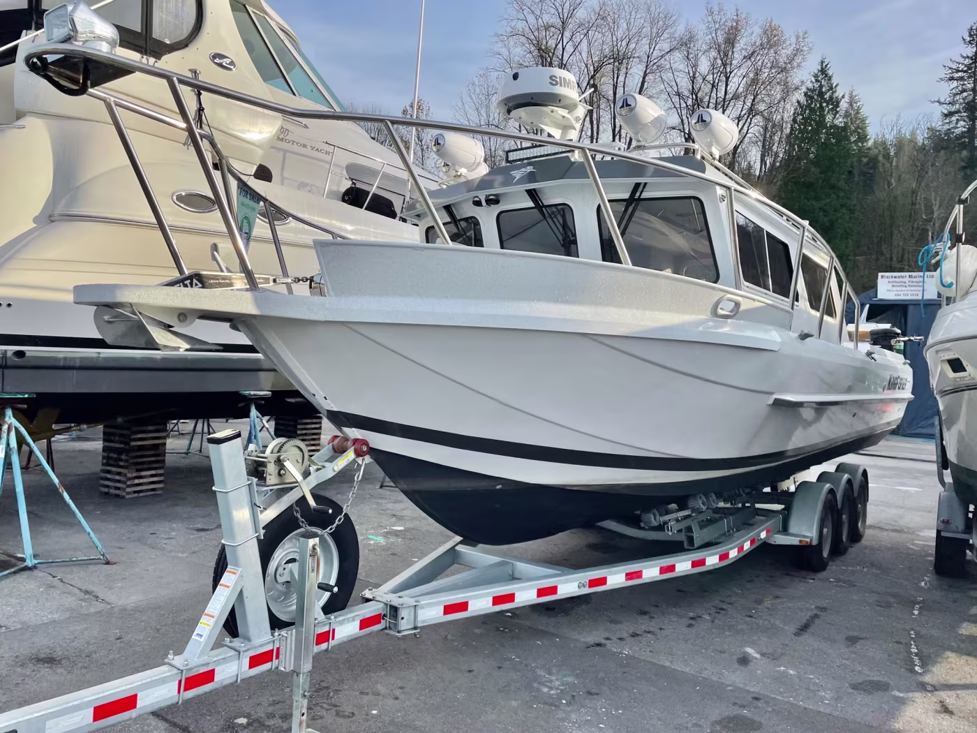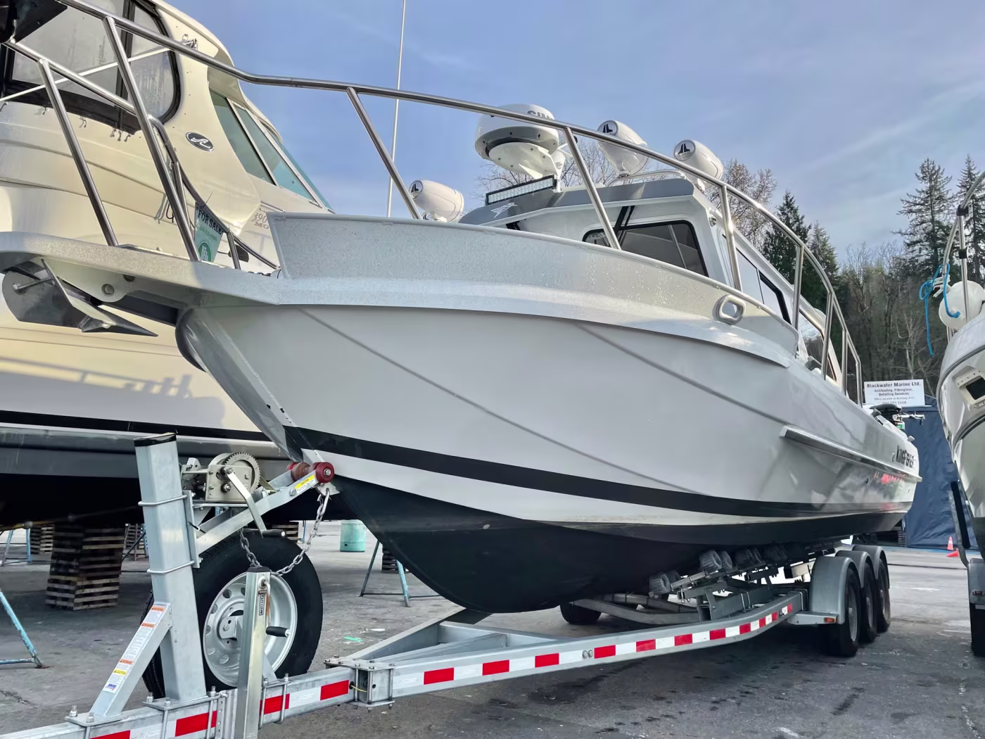 Fully loaded 2021 Kingfisher 3025 Destination. Custom built for Reel West Coast. Finished in Glacier White aluminum and twin cold fusion white Mercury engines. Featuring Corbin Shockwave S5 captain's chair, Dual helm Simrad electronics, Power windlass, Sidepower bow thruster, Highly upgraded JL Audio / Rockford Fosgate stereo, Folding wood dining table, Ultra deck flooring, Espar diesel heat, Enclosed head with electric toilet, Galley fridge and sink, Front bed area, Interior and exterior rod holders, Roof racks with kayak holders, Scotty down riggers, Cannon balls, Port and starboard fish boxes, Front and rear LED light bards, Updated with the finest fishing and cruising amenities, 2020 EZ Loader triple axle trailer included. Power is provided by twin Mercury 200XL DTS with 598 hours. Described as light and agile on the water – with a sleek profile that makes the 3025 Destination a dream boat. This boat and trailer package is ready to go fishing! Well maintained and just serviced. Leasing and financing available. All trades accepted.