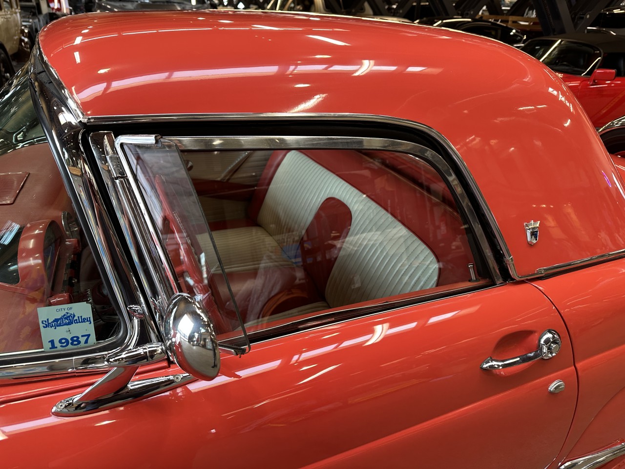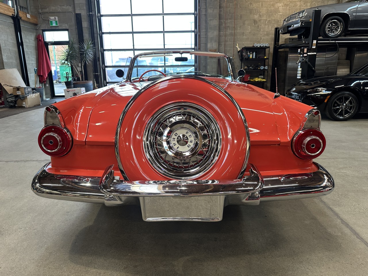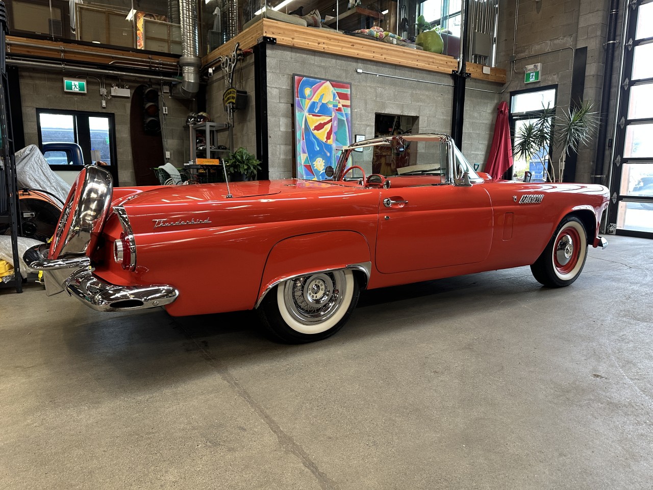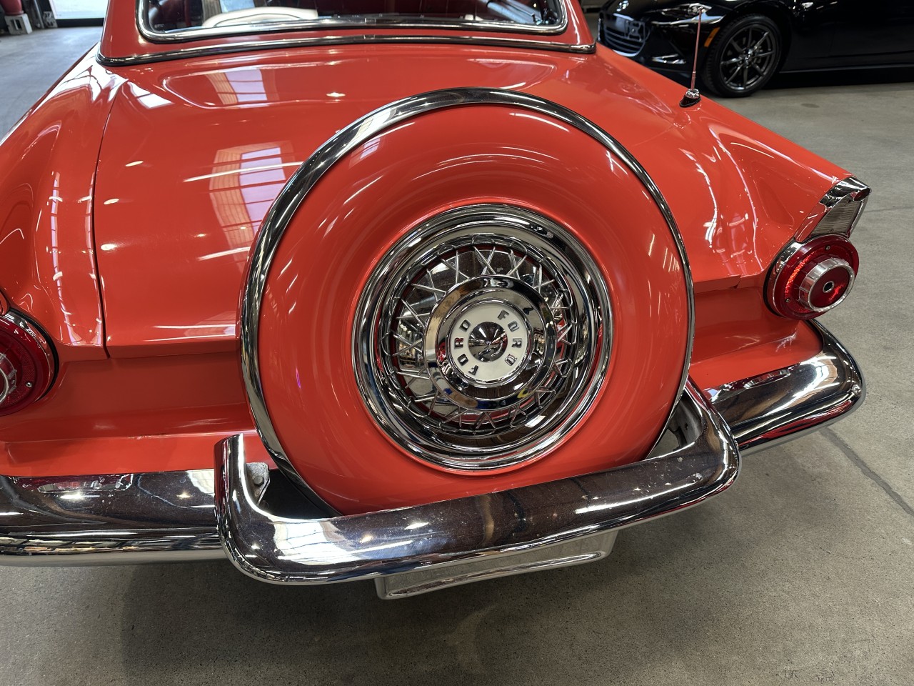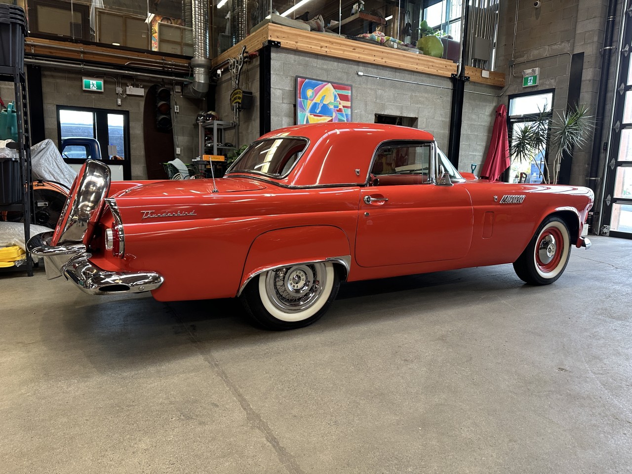 1956 Ford Thunderbird. Shows 2,600 Miles (5 Digit ODO). Well equipped with Red and white vinyl seat, Town and Country radio, Engine turned interior trim, Removable colour matched hard top, Chrome bumpers, Rear bumper with side exit exhaust, Body-colour Continental spare wheel assembly, Window wind wings, 15" Wheels with wire inserts. 292Ci V8 mated to a 3 speed manual transmission rated by the factory new at 202hp / 289lb-ft. Well maintained and just serviced. Leasing and financing available. All trades accepted.