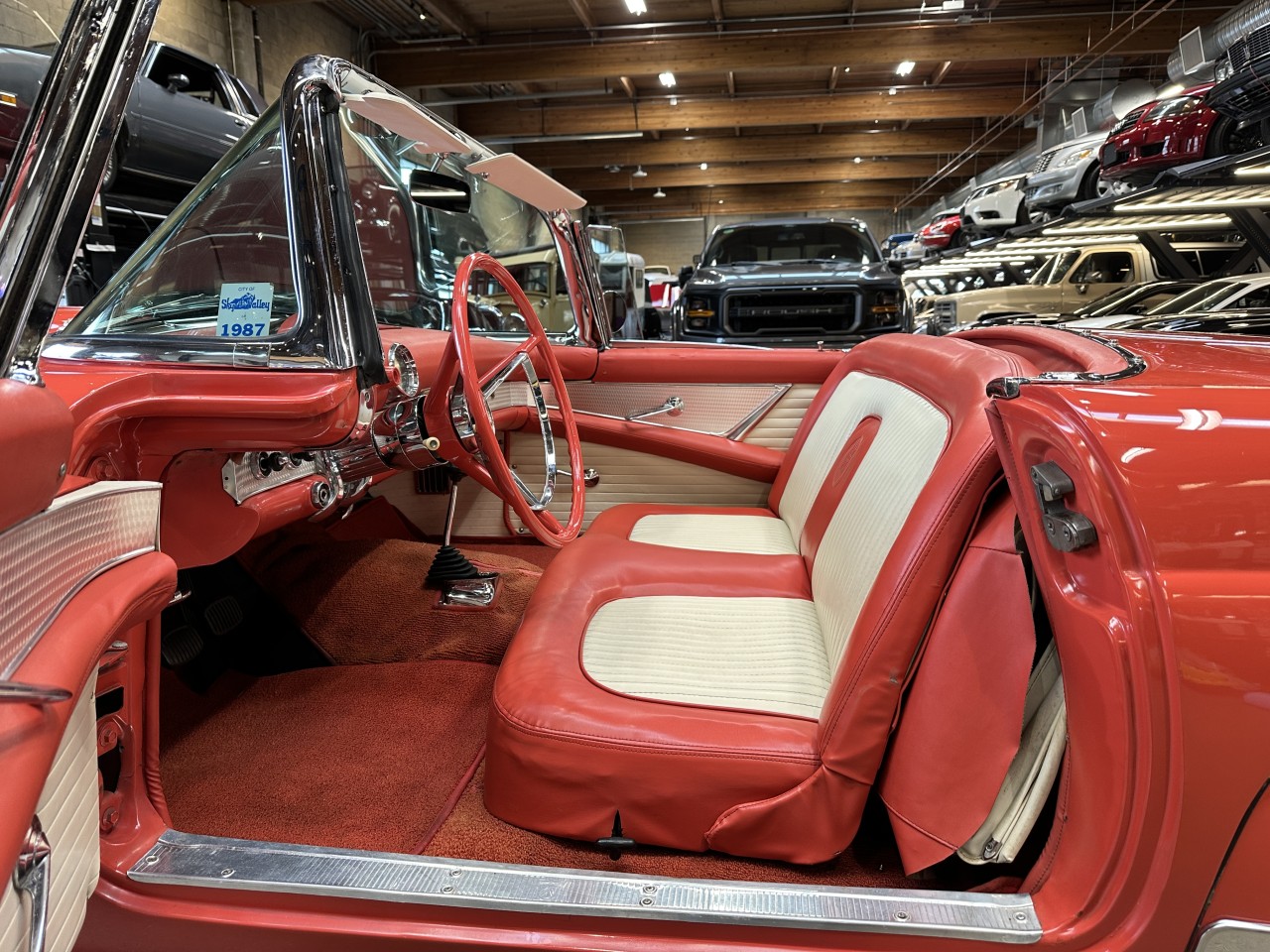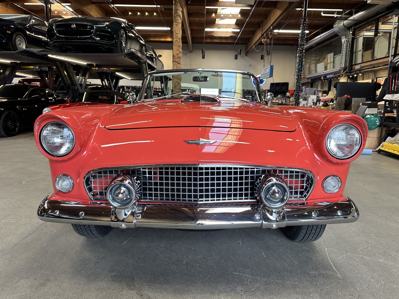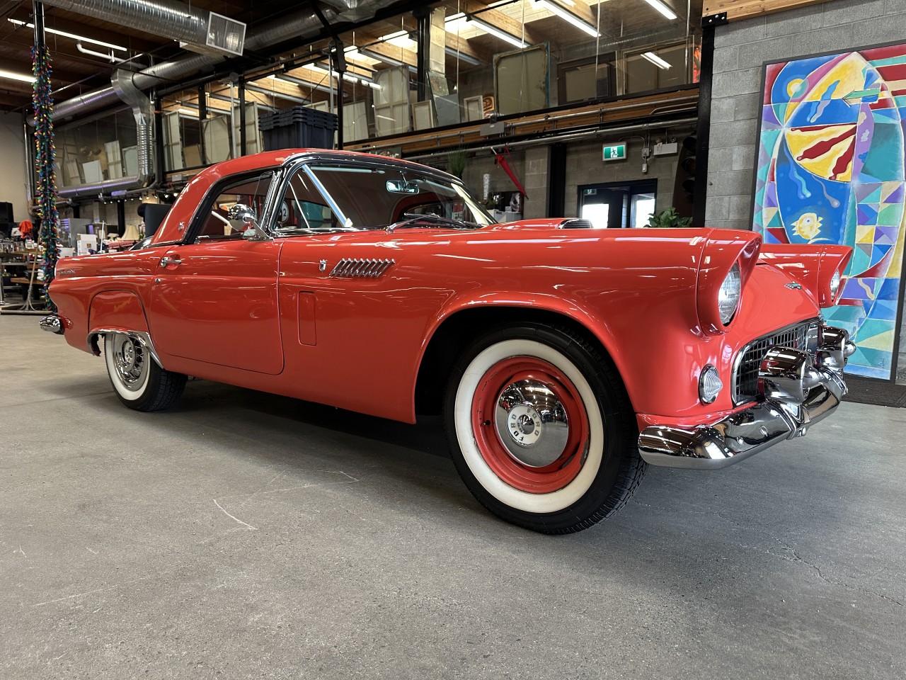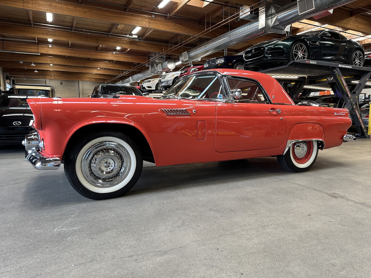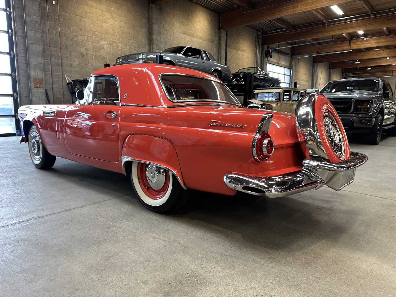 1956 Ford Thunderbird. Shows 2,600 Miles (5 Digit ODO). Well equipped with Red and white vinyl seat, Town and Country radio, Engine turned interior trim, Removable colour matched hard top, Chrome bumpers, Rear bumper with side exit exhaust, Body-colour Continental spare wheel assembly, Window wind wings, 15" Wheels with wire inserts. 292Ci V8 mated to a 3 speed manual transmission rated by the factory new at 202hp / 289lb-ft. Well maintained and just serviced. Leasing and financing available. All trades accepted.
