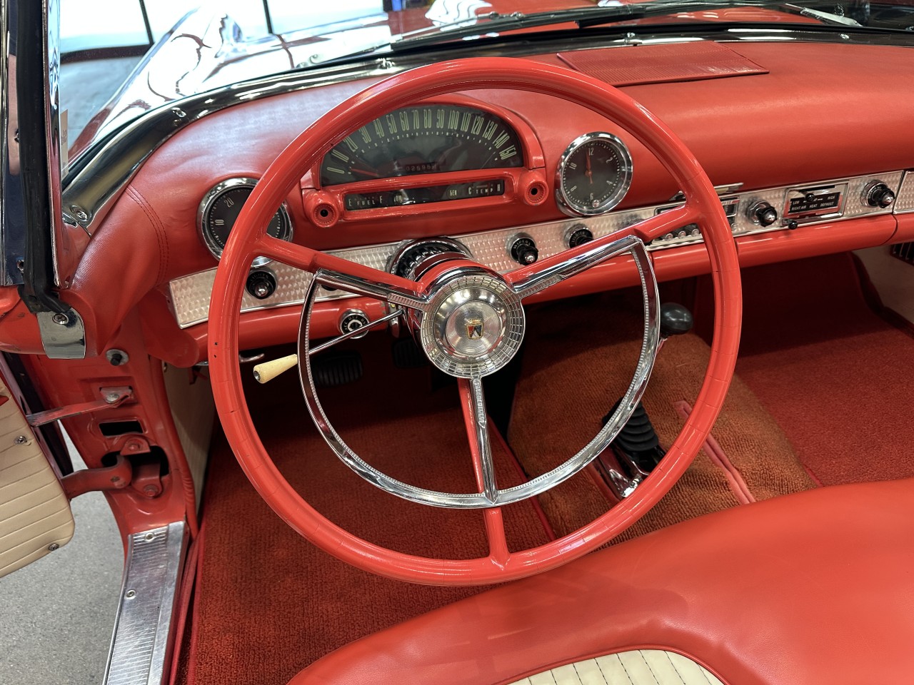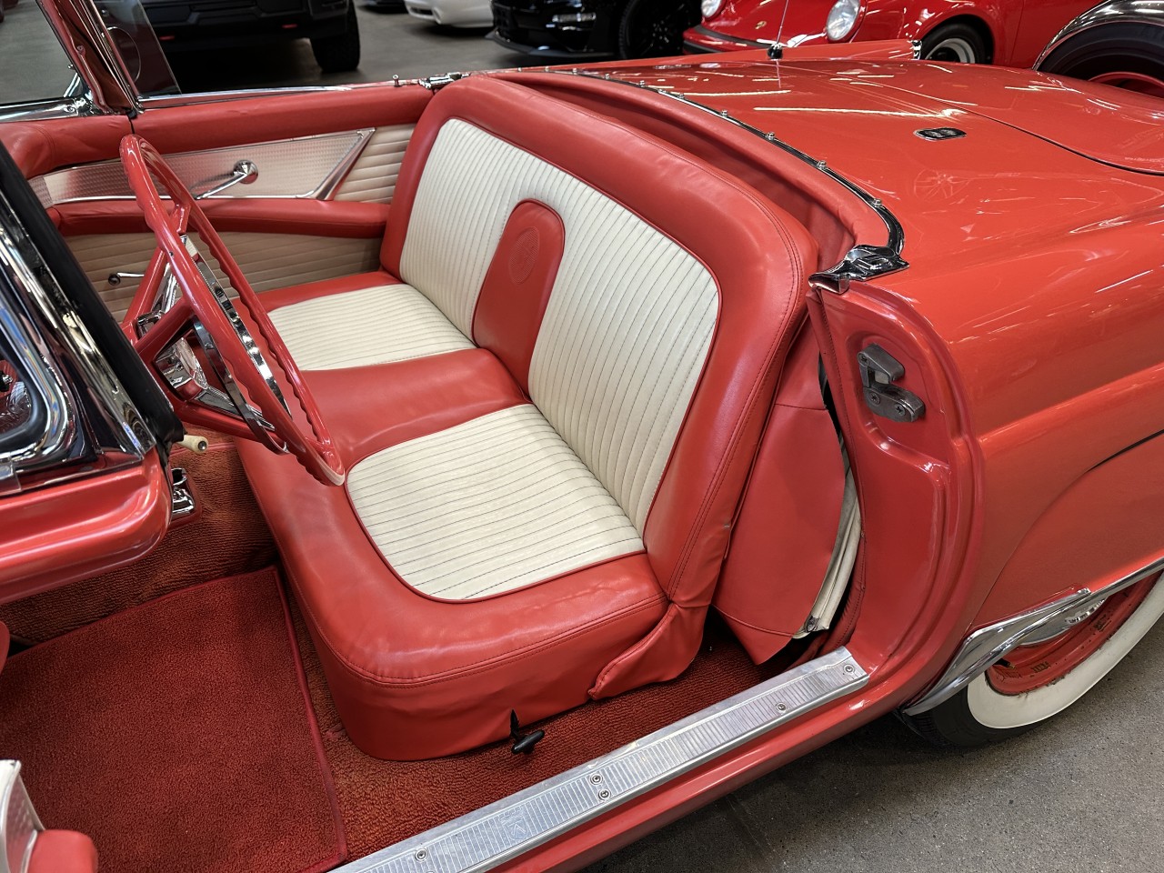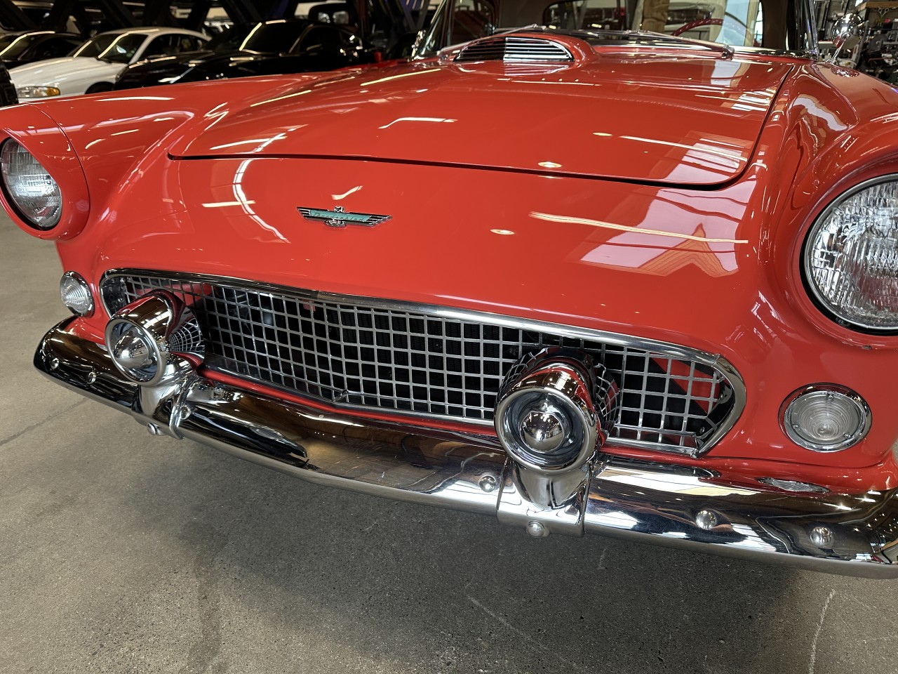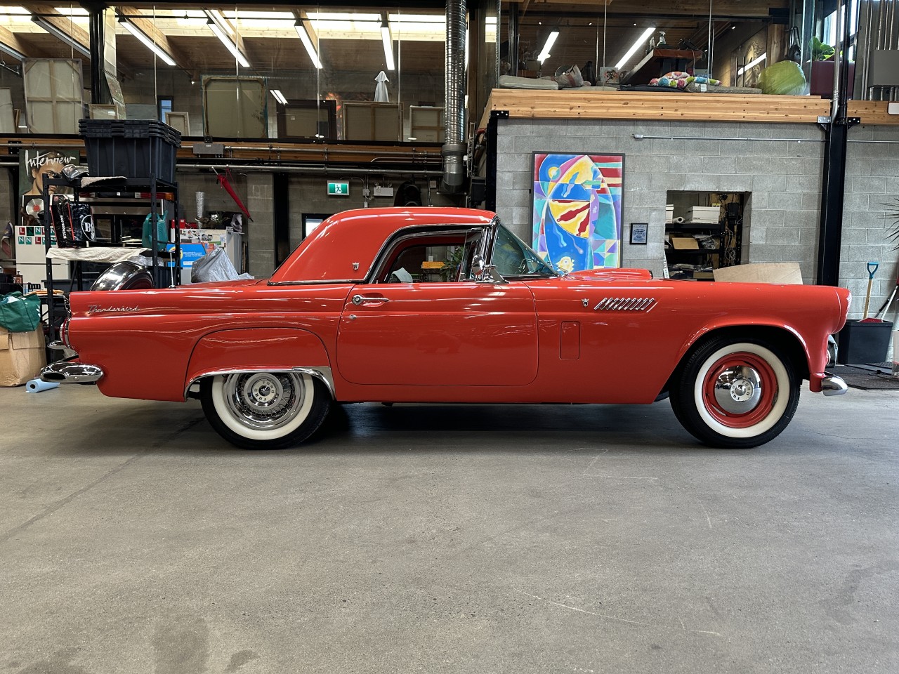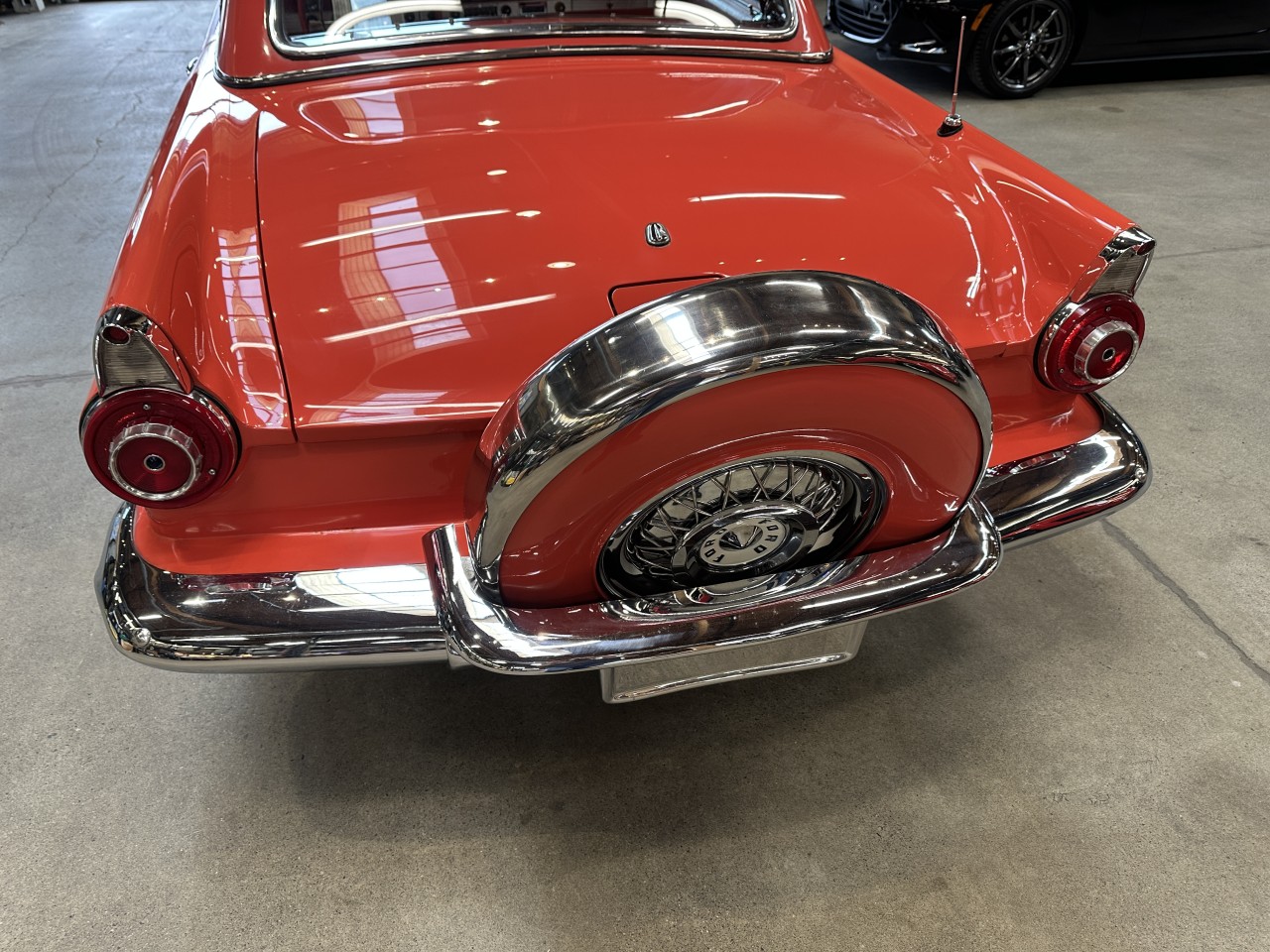 1956 Ford Thunderbird. Shows 2,600 Miles (5 Digit ODO). Well equipped with Red and white vinyl seat, Town and Country radio, Engine turned interior trim, Removable colour matched hard top, Chrome bumpers, Rear bumper with side exit exhaust, Body-colour Continental spare wheel assembly, Window wind wings, 15" Wheels with wire inserts. 292Ci V8 mated to a 3 speed manual transmission rated by the factory new at 202hp / 289lb-ft. Well maintained and just serviced. Leasing and financing available. All trades accepted.