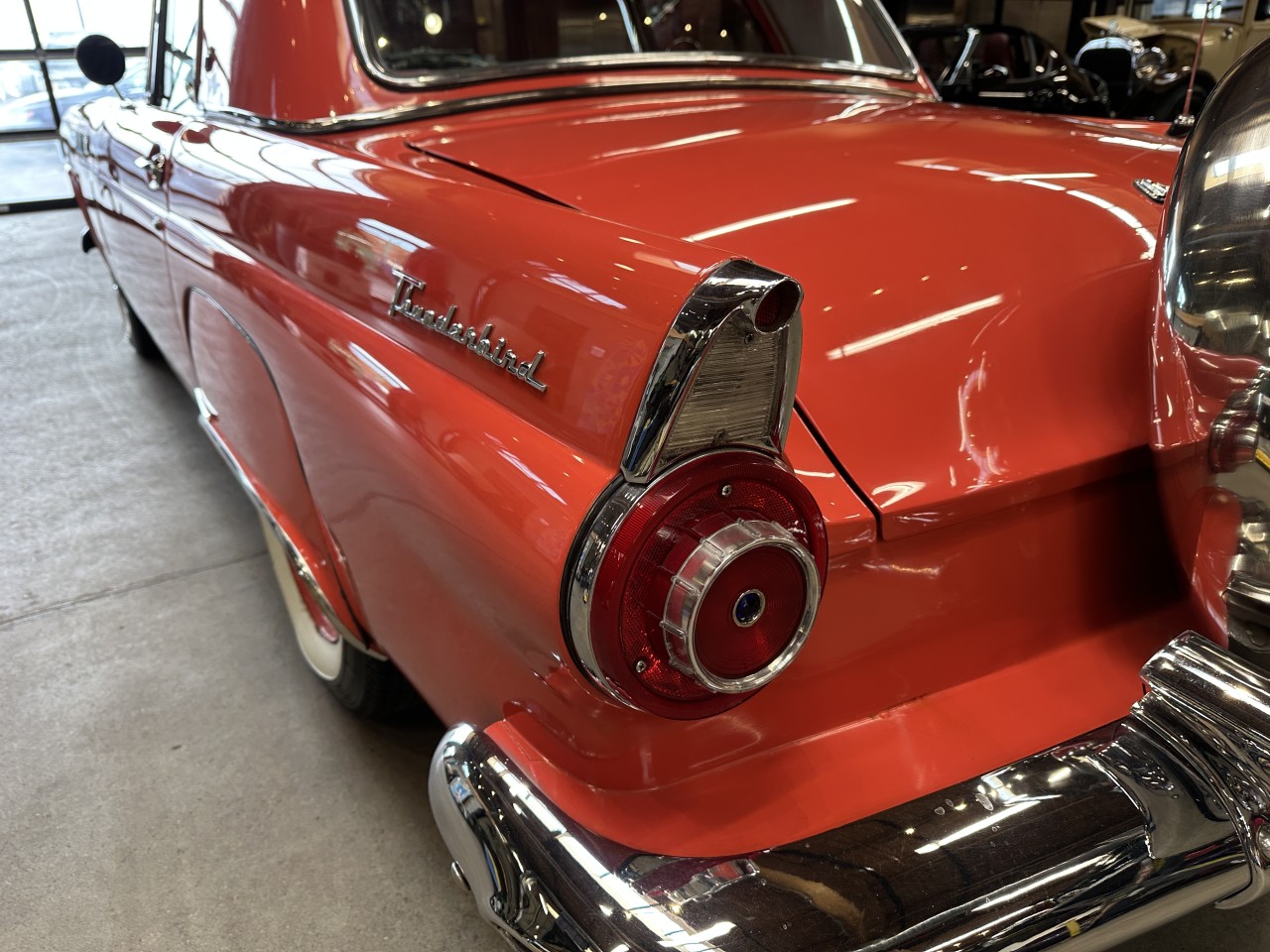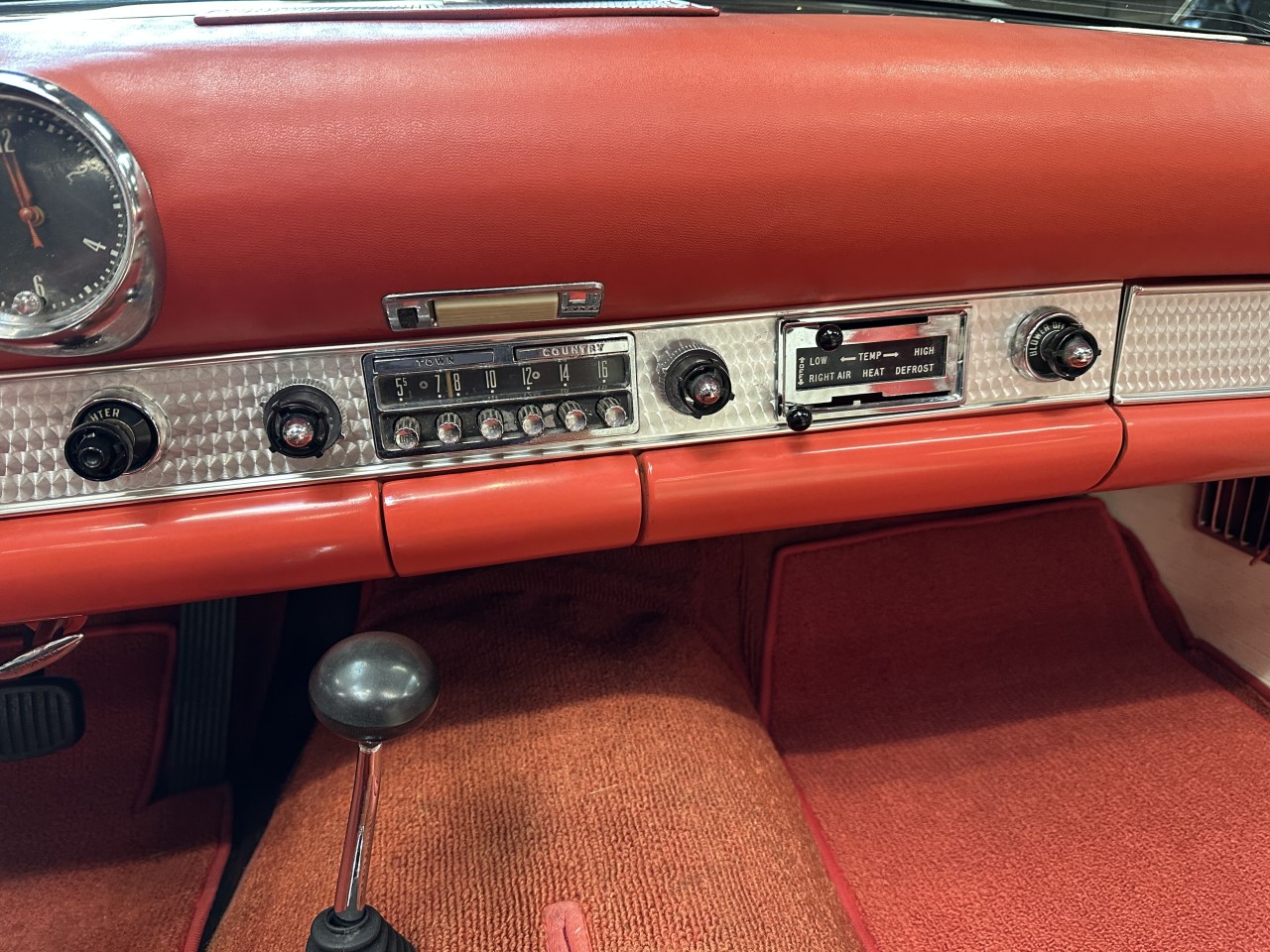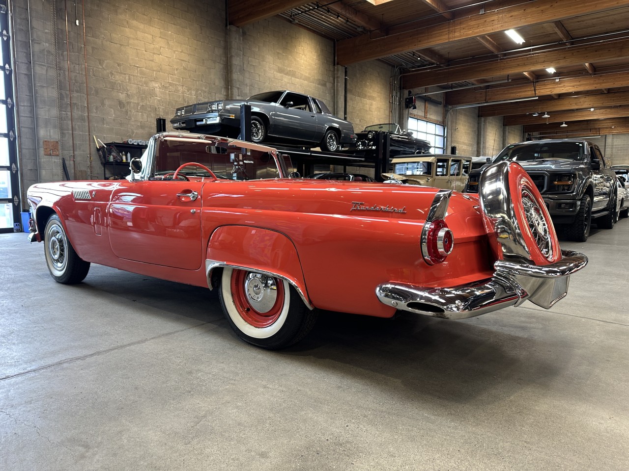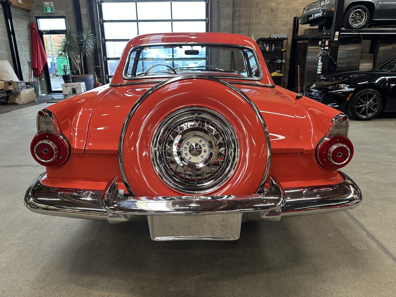 1956 Ford Thunderbird. Shows 2,600 Miles (5 Digit ODO). Well equipped with Red and white vinyl seat, Town and Country radio, Engine turned interior trim, Removable colour matched hard top, Chrome bumpers, Rear bumper with side exit exhaust, Body-colour Continental spare wheel assembly, Window wind wings, 15" Wheels with wire inserts. 292Ci V8 mated to a 3 speed manual transmission rated by the factory new at 202hp / 289lb-ft. Well maintained and just serviced. Leasing and financing available. All trades accepted.