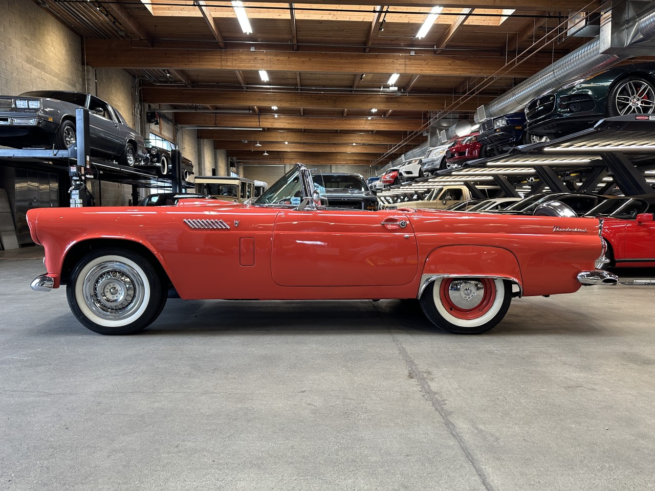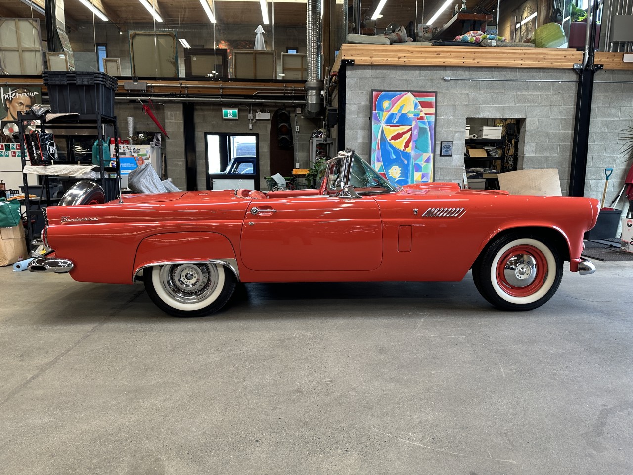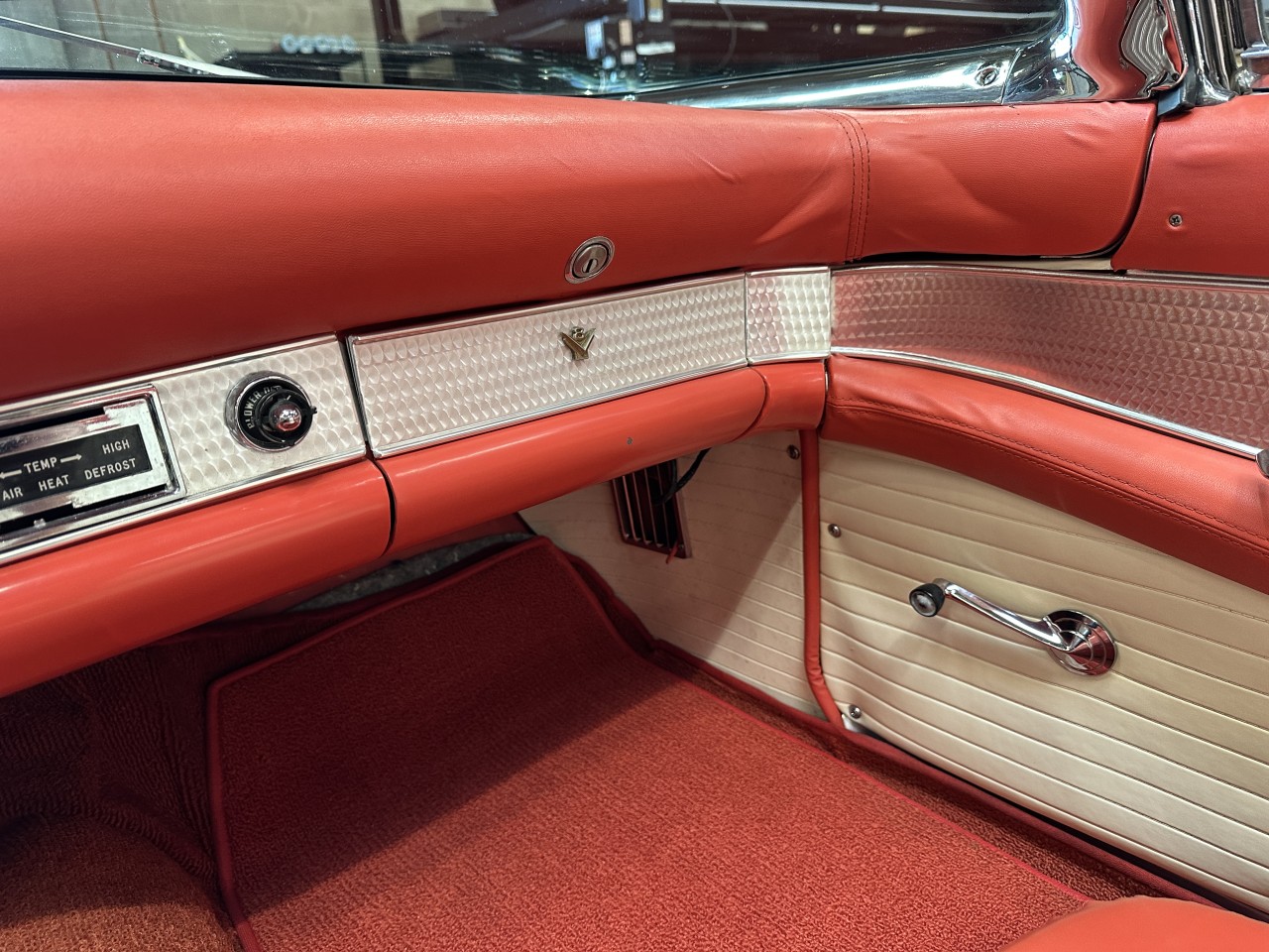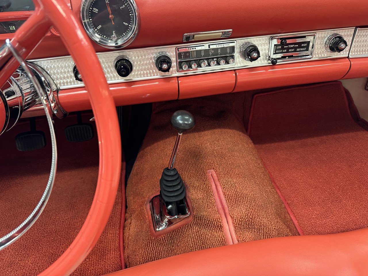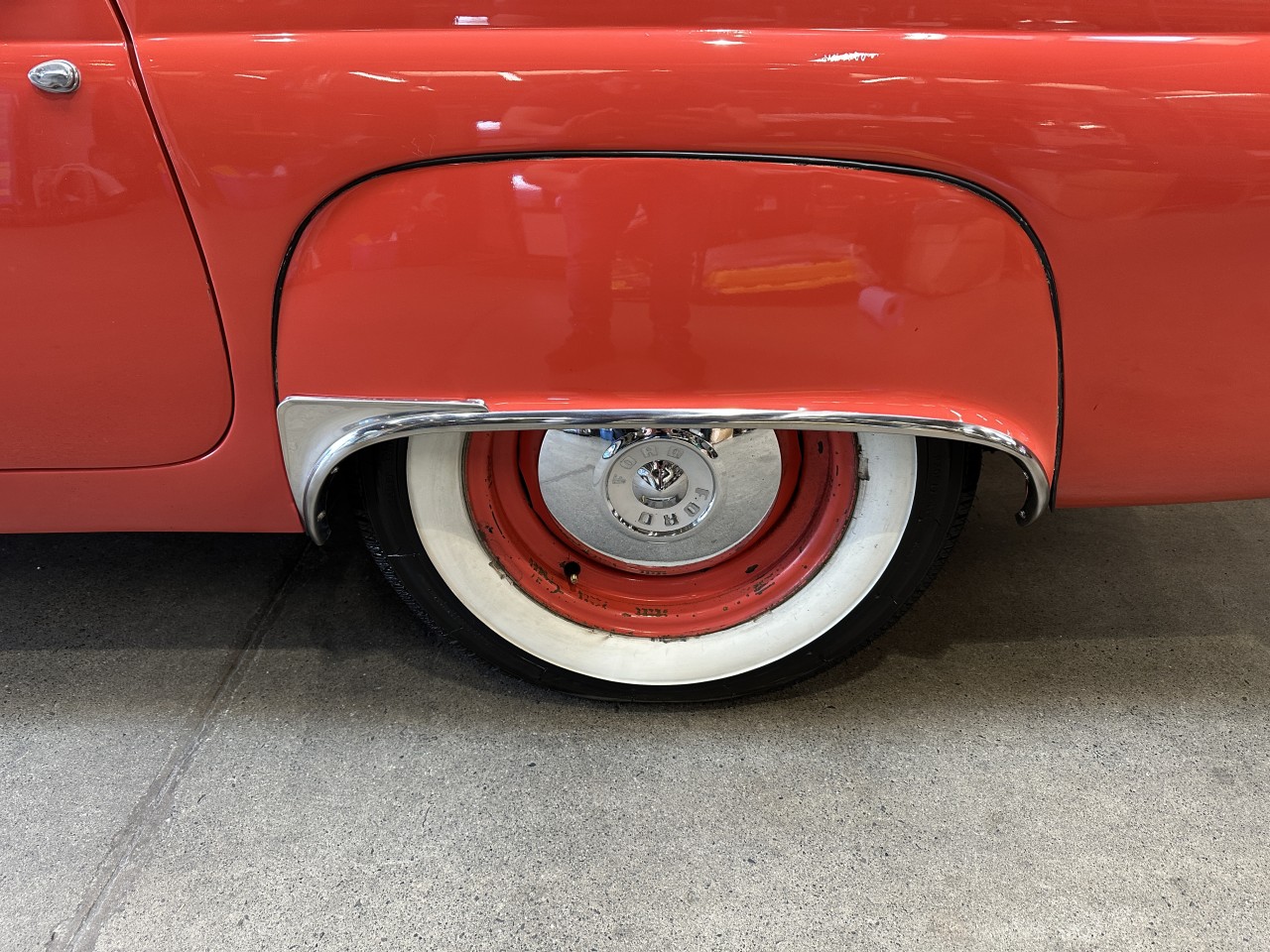 1956 Ford Thunderbird. Shows 2,600 Miles (5 Digit ODO). Well equipped with Red and white vinyl seat, Town and Country radio, Engine turned interior trim, Removable colour matched hard top, Chrome bumpers, Rear bumper with side exit exhaust, Body-colour Continental spare wheel assembly, Window wind wings, 15" Wheels with wire inserts. 292Ci V8 mated to a 3 speed manual transmission rated by the factory new at 202hp / 289lb-ft. Well maintained and just serviced. Leasing and financing available. All trades accepted.