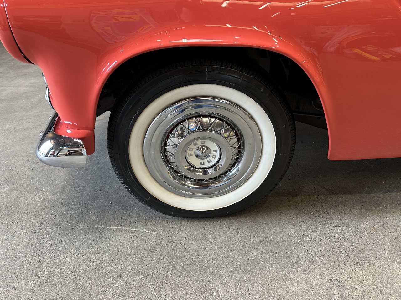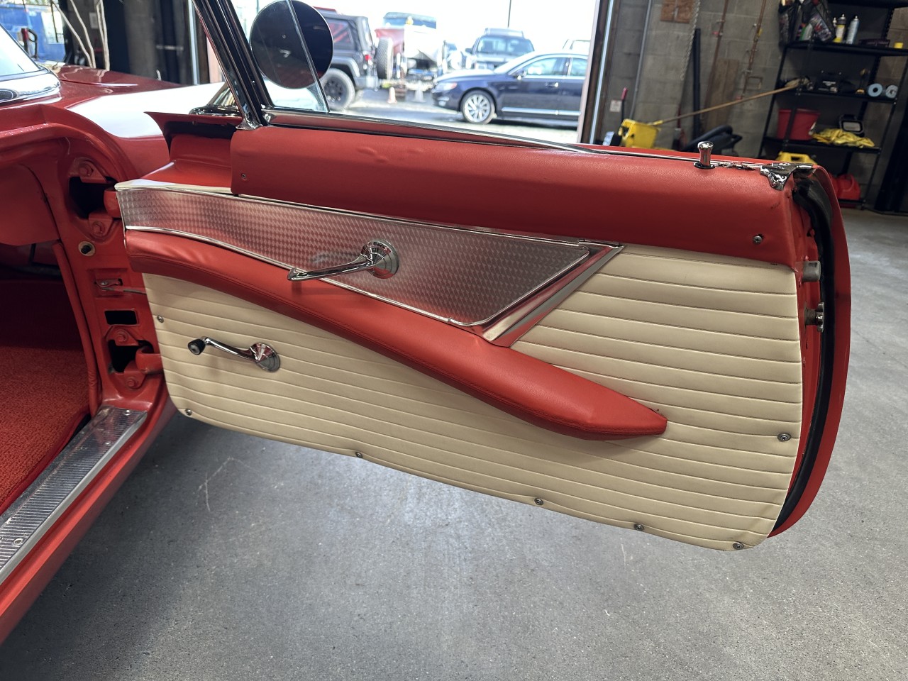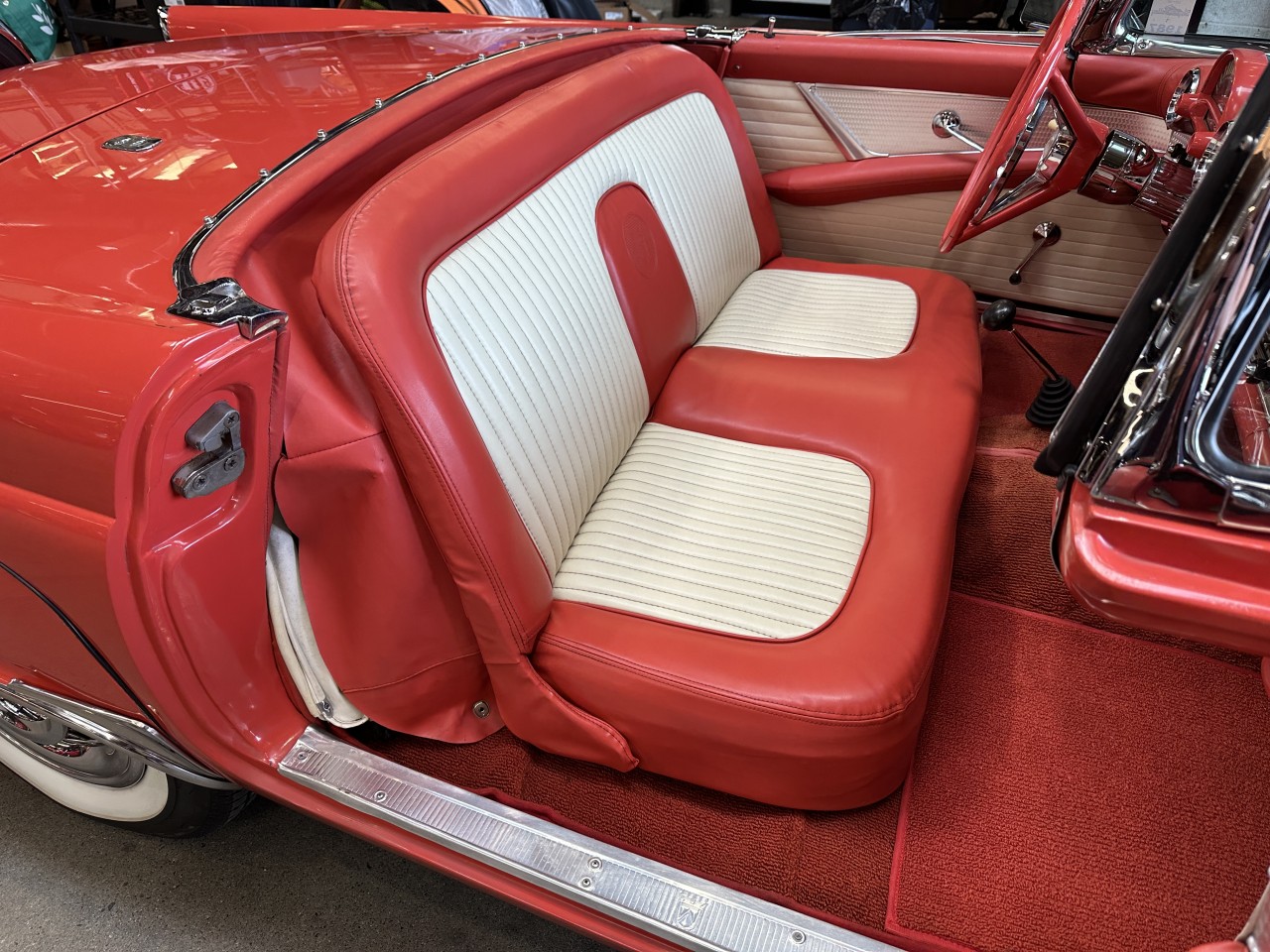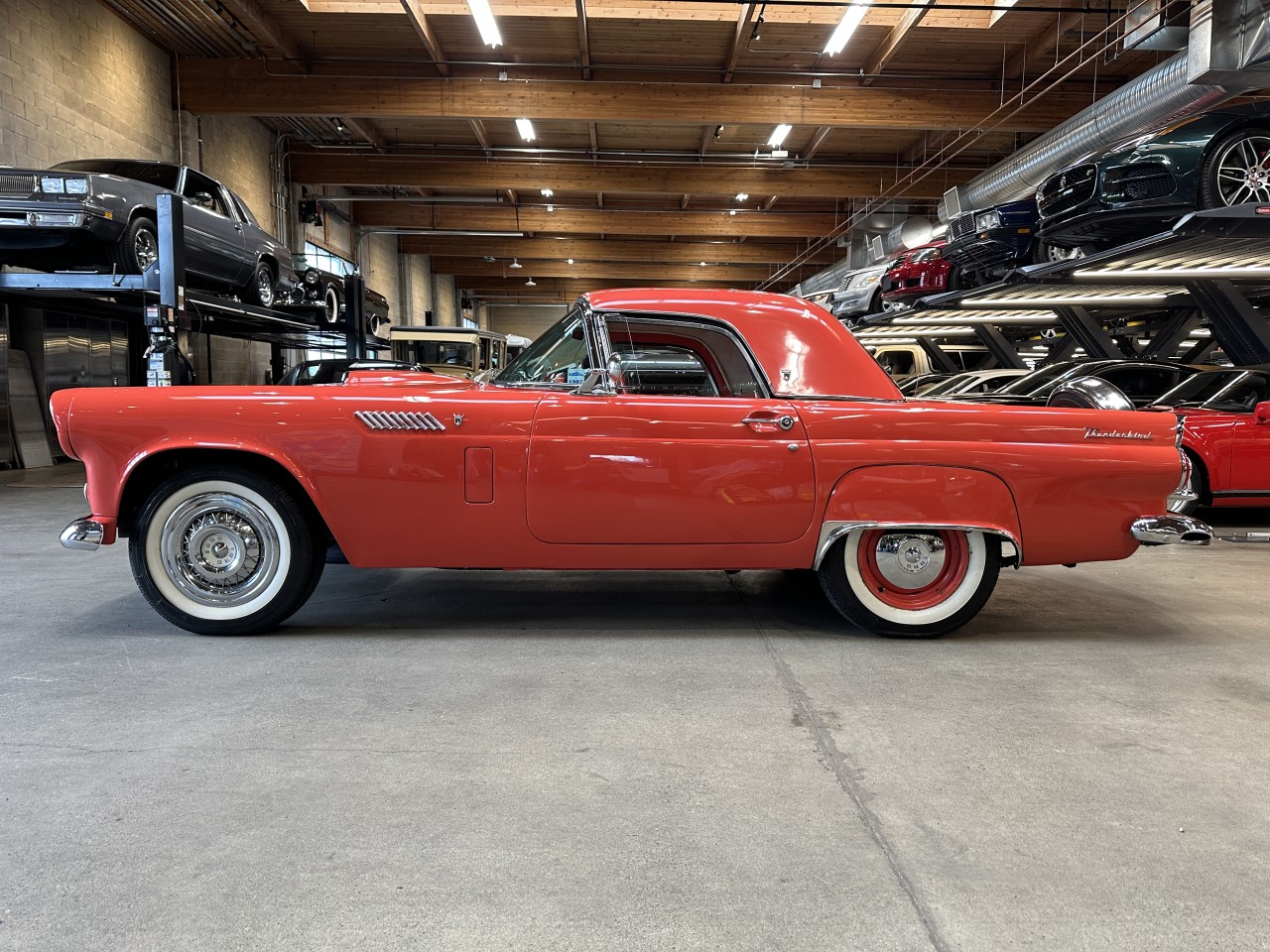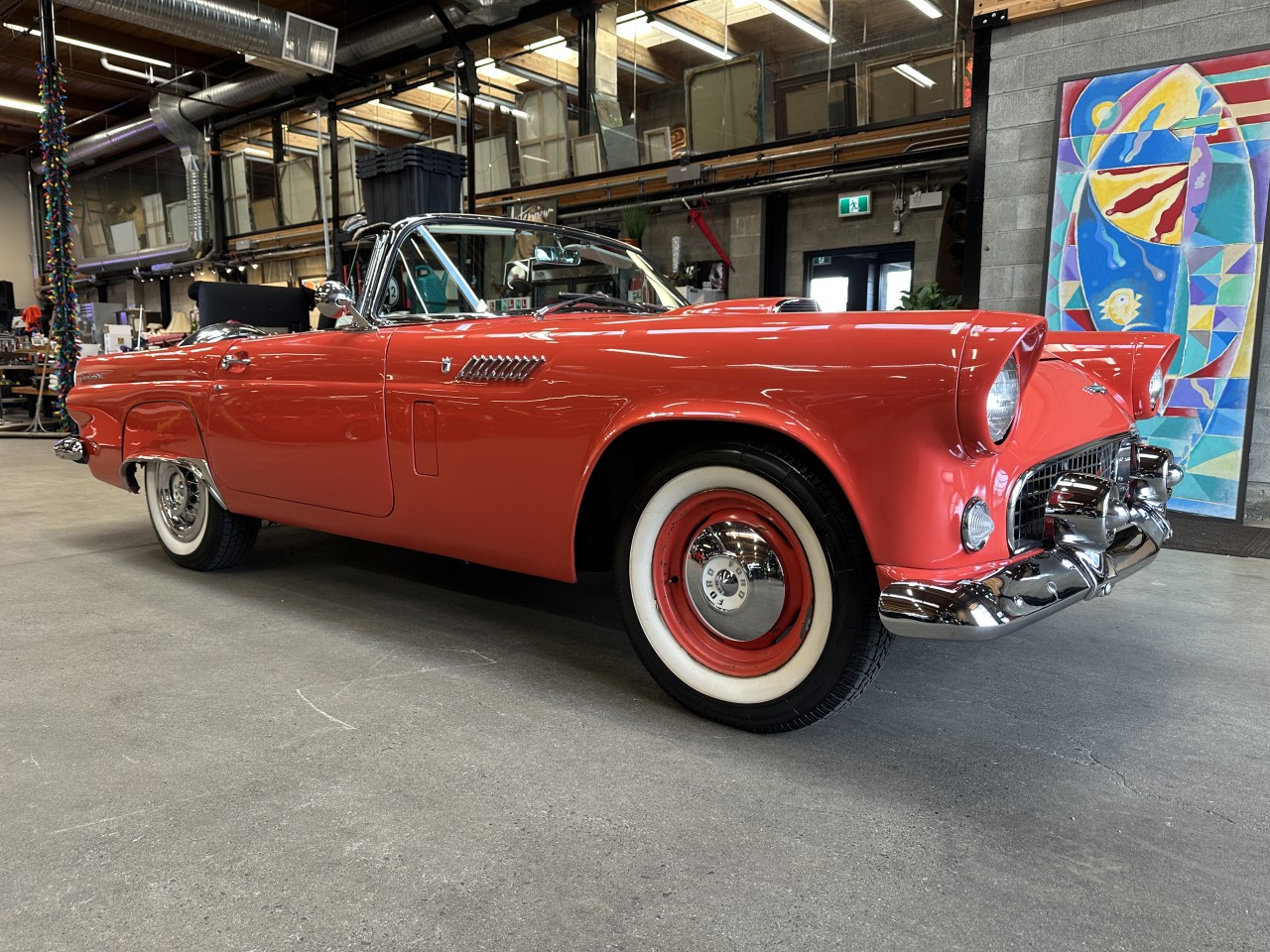 1956 Ford Thunderbird. Shows 2,600 Miles (5 Digit ODO). Well equipped with Red and white vinyl seat, Town and Country radio, Engine turned interior trim, Removable colour matched hard top, Chrome bumpers, Rear bumper with side exit exhaust, Body-colour Continental spare wheel assembly, Window wind wings, 15" Wheels with wire inserts. 292Ci V8 mated to a 3 speed manual transmission rated by the factory new at 202hp / 289lb-ft. Well maintained and just serviced. Leasing and financing available. All trades accepted.