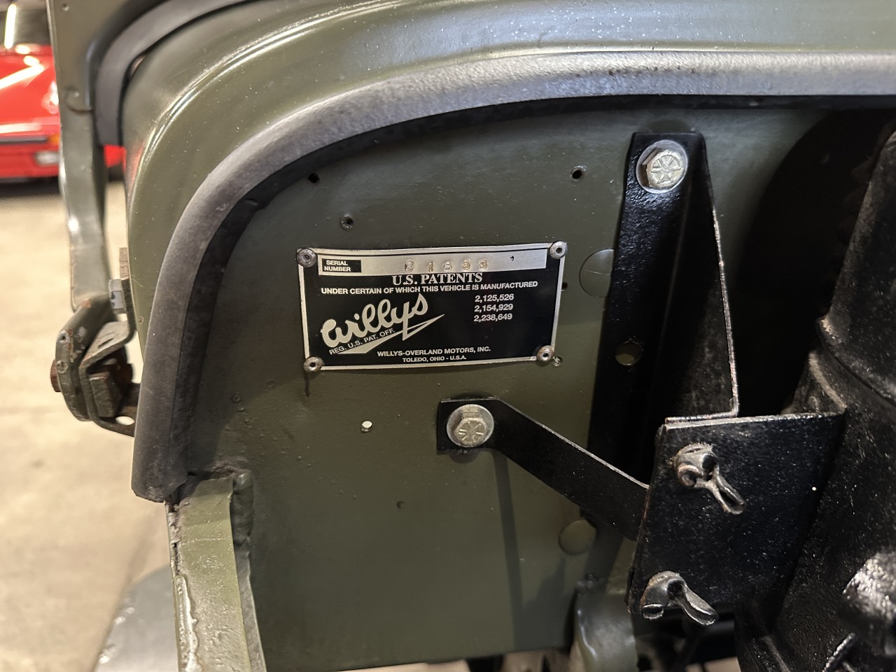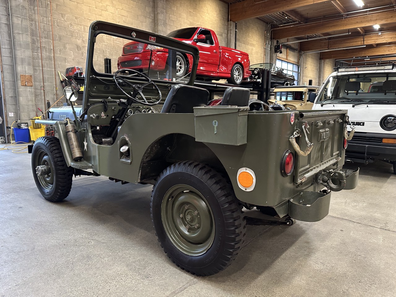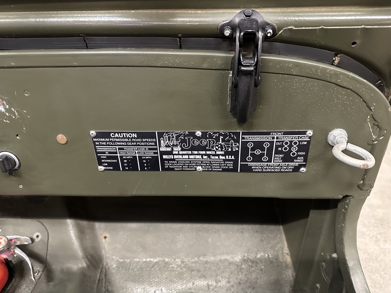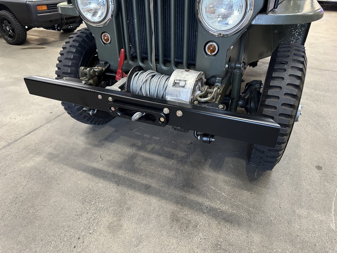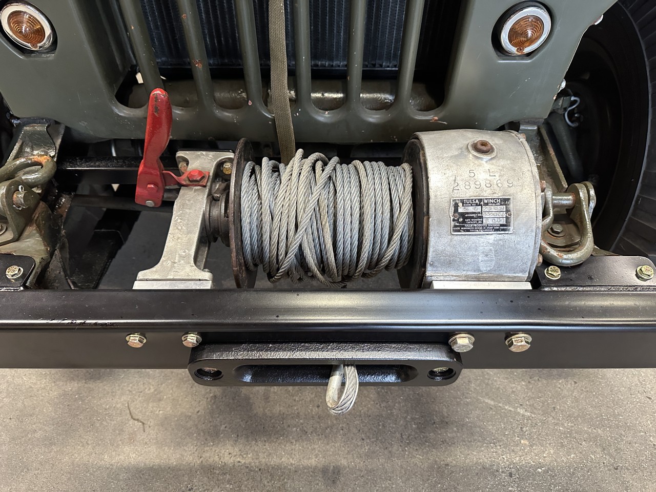 1946 Willys-Overland CJ-2A. 52,200 Miles Shown (5 Digit ODO). Featuring Twin front seats, Windshield wipers, Custom winch mount front bumper, Tulsa 8000LB winch, Dual tail lights, Turn signals, Folding front windshield, Single side mirror, Drop-down tailgate, Dual range transfer case, Green 16" wheels. 135Ci L-head inline 4 cylinder mated to a 3 on the tree manual transmission rated by the factory new at 60hp / 106lb-ft.