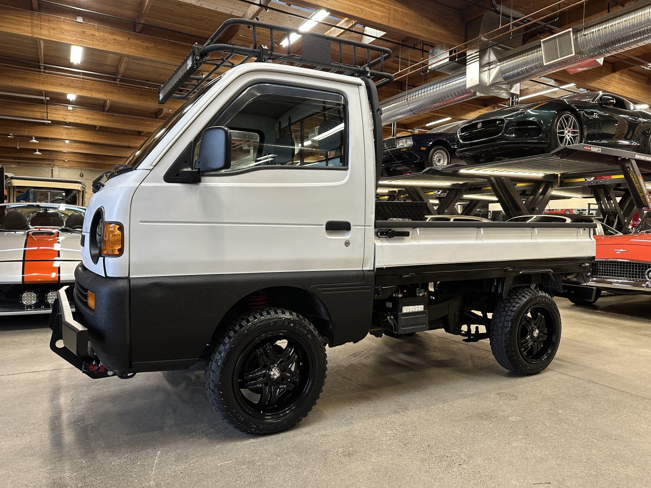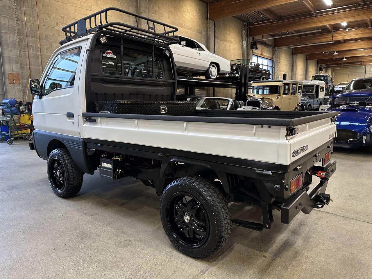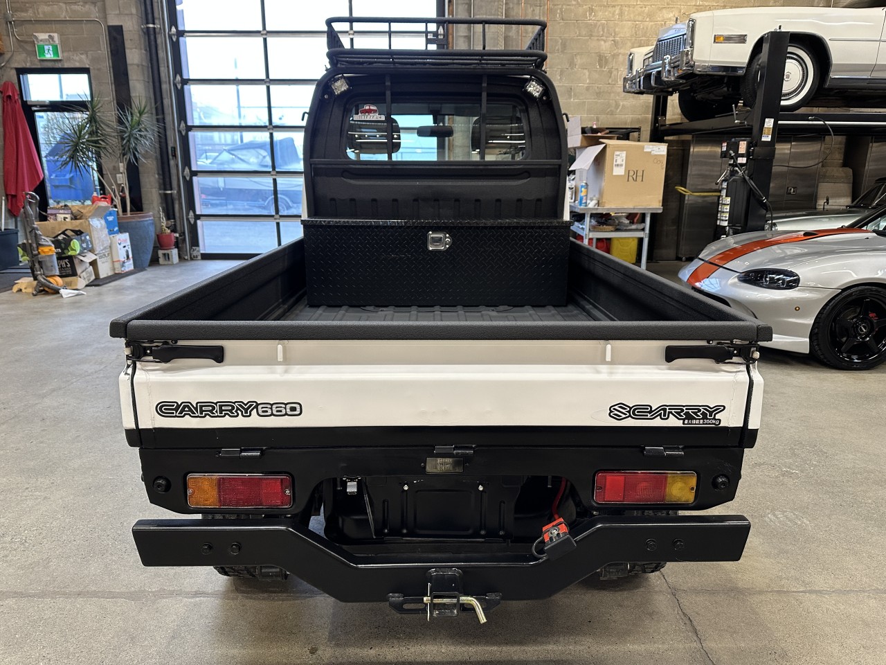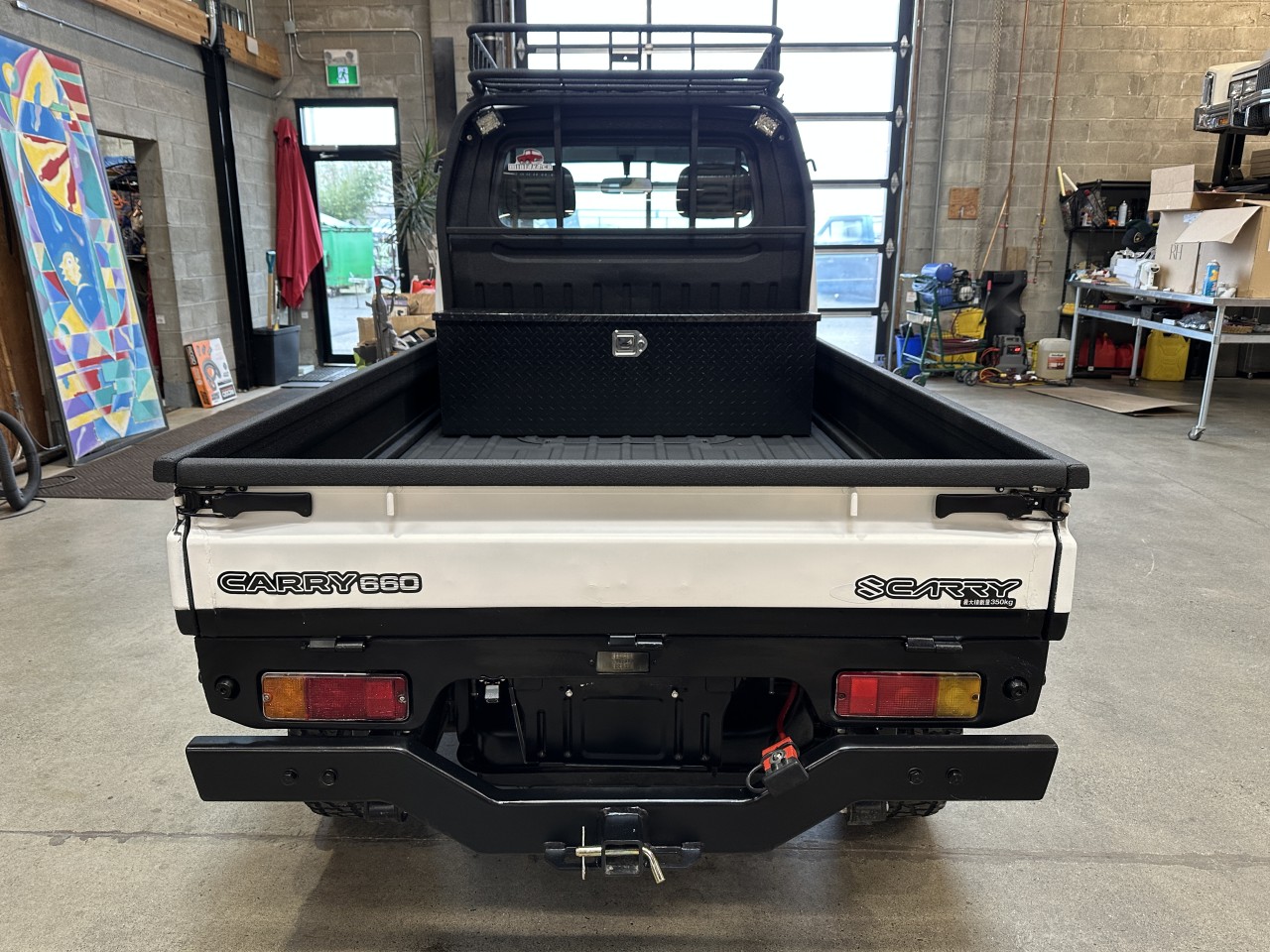 1996 Suzuki Carry 660 4WD Right Hand Drive. Well equipped with Grey / black vinyl seats, Touch screen head unit, Bluetooth, Bluetooth audio, Apple CarPlay, Android Auto, Boss component speakers, Compustar alarm system, Back up camera, Roof rack, Box liner on box / lower body panels / back of cab / rear rack / cargo carrier rack, Black checker plate storage box, Rear LED spot lights, LED Front light bar, LED Headlights, Front and rear steel bumpers with hitch mount for winch, Fieryred 5500lb winch, Suspension lift, 14" Black Mini4x4.ca wheels. 657cc Carbureted 3 cylinder mated to a 4 speed manual transmission rated by the factory at 42hp / 42lb-ft. Well maintained and just serviced. Leasing and financing available. All trades accepted.